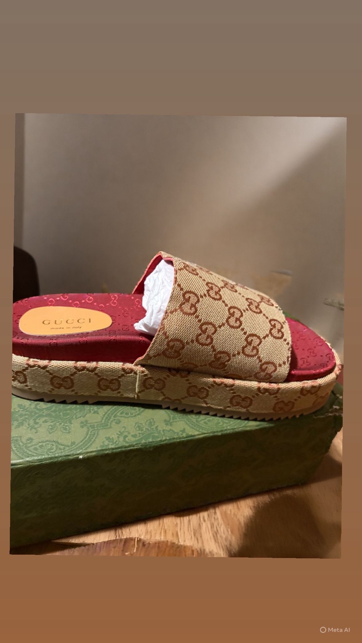 Authentic Gucci GG platform slides in beige monogram. Never worn, only tried on and stored. No wear on soles or footbed—excellent condition. Slip-on style with a wide strap, comfortable platform, and red Gucci footbed. Great deal if you want designer slides without paying retail. Serious buyers only. Message me for more photos or details.