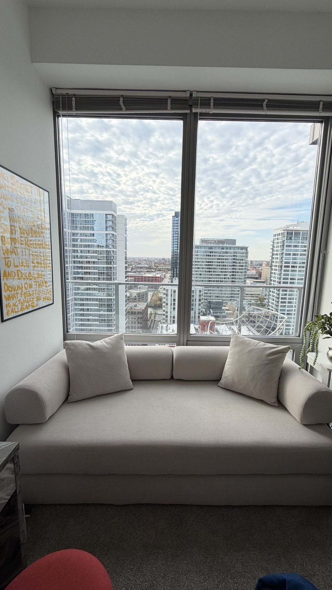 I love it and it has been a great addition to my second bedroom for lounging, but due to an unexpected need to transform the room, l am now selling it before I could even use it. It's only been sat in maybe 10 times. It's great for if you have guests sleeping over because it can become a queen size bed and it's much sturdier than an inflatable mattress! Smoke free, pet free home. Located in the South Loop. Please only message if you have specific questions or to arrange a pickup time. If it's posted, it's available. Dimensions are included in the third picture