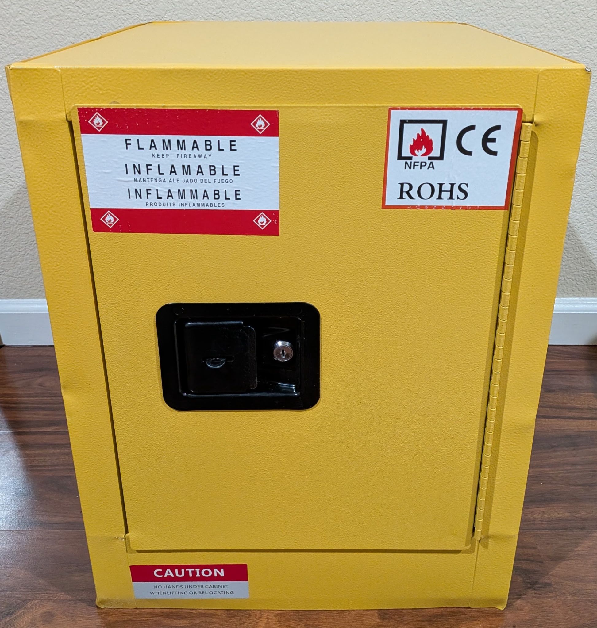 Yellow metal storage cabinet with lock. Has a shelf inside and a caution label on the front and inside. Sturdy and secure.