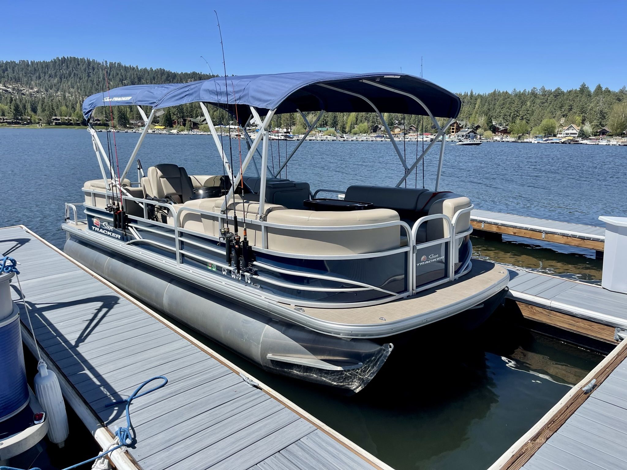 The 2019 PARTY BARGE® 22 XP3 is the luxury tritoon boat that's going to turn your lake adventures up to 11! Speaking of 11—that's how big a crew this spacious SUN TRACKER® holds! And there's room for everyone to relax in this pontoon boat thanks to 4 corner lounges and 2 captain's chairs. Stash and secure plenty of gear in the hidden storage spaces under the lounges' seats and behind the seat backs. Access the PARTY BARGE® via the 3 inward-swinging gates, which includes a wheelchair-accessible port gate. The 2 10' QuickLift® bimini top extends out to provide plenty of shade on sunny days. The standard Wet Sounds® stereo is Bluetooth®-compatible and boasts 4 upholstery speakers. 2 in-floor anchor points allow you to customize your space with the included moveable table and optional ski-tow pylon. This pontoon gets increased performance with the addition of a third pontoon log, as well as lifting strakes, underpinning, and hydraulic steering. The PARTY BARGE® 22 XP3 comes with a 200hp Mercury® L FourStroke outboard motor. - 2 Cannon Magnum 5 down riggers that are removable and multiple fishing rod holders. -Propane bbq Very low hours. Only 64hrs. Always stored in doors. Like new. Trailer included new tires. 45k obo