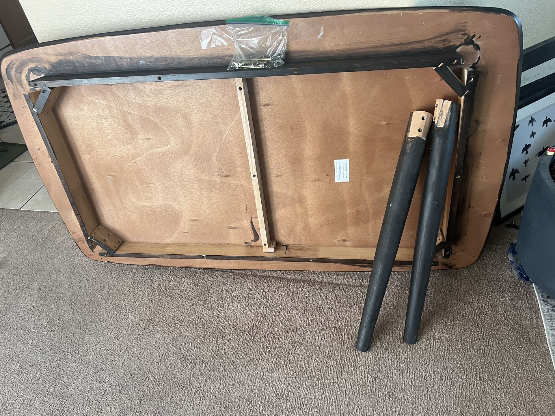 Well loved table. Very heavy. Still has lots of life left in it. All 4 legs and all hardware is included with the table-nothing is missing. 60” l 33” w 29” h Delivery not available. Must pick up. No trades.