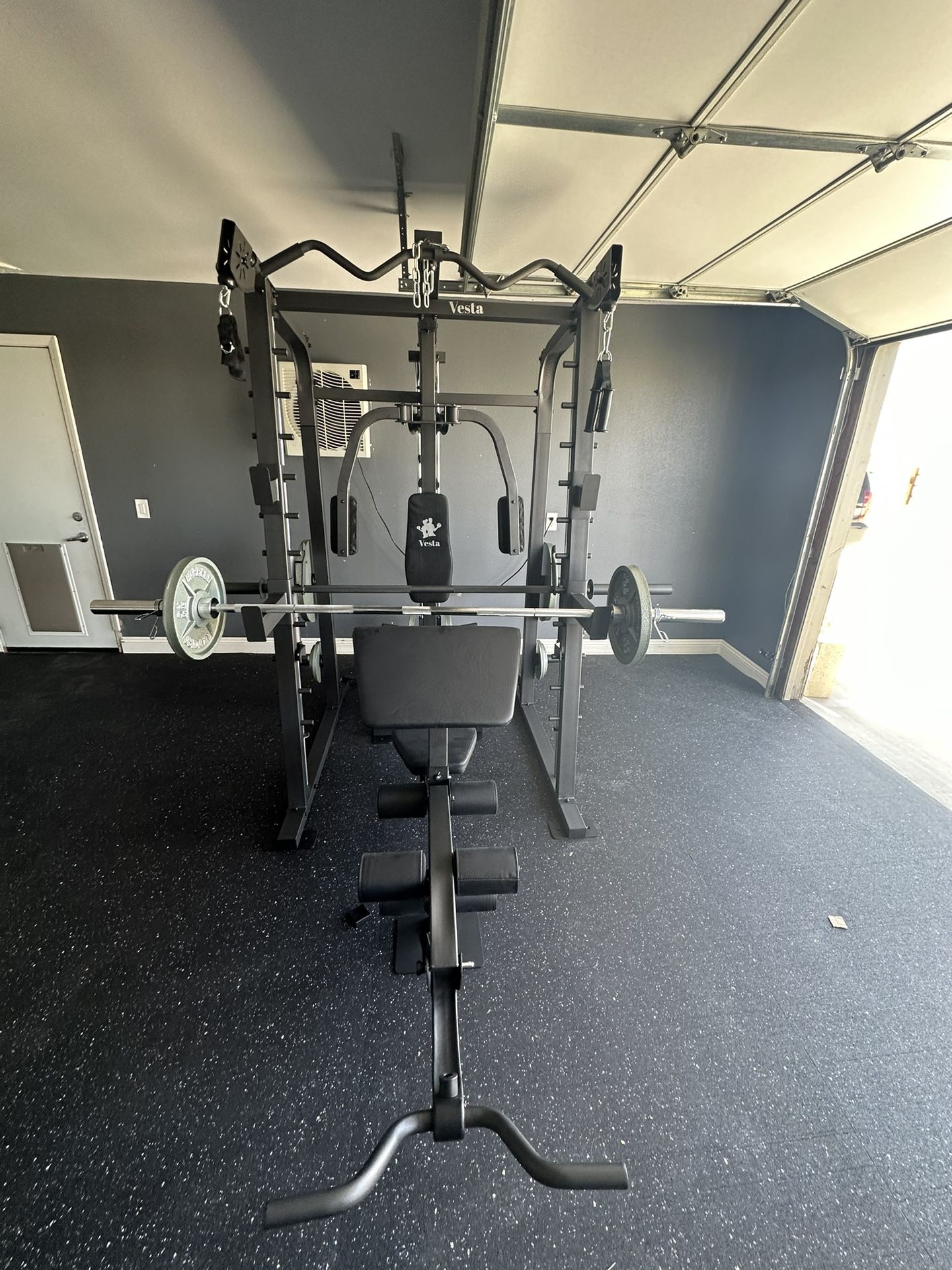 Vesta Fitness Smith Machine 2001 w/Bench Attachment | 230lb Bumpers Weights | 7ft Olympic Bar | Fitness | Gym Equipment | FREE DELIVERY 🚚