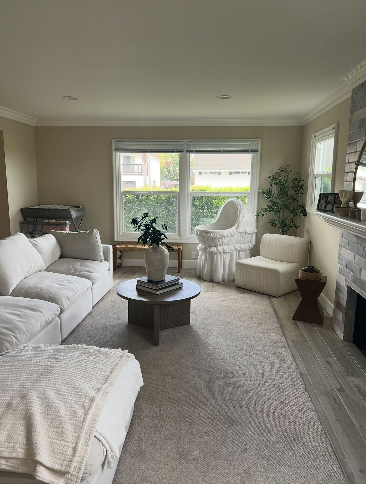 L shaped couch $500, $50 round coffee table, accent chair w/footstool $100, armless accent chair $40, stone top side table $50, 2 small side tables $25ea, console $25, large picture $10, round mirror $10