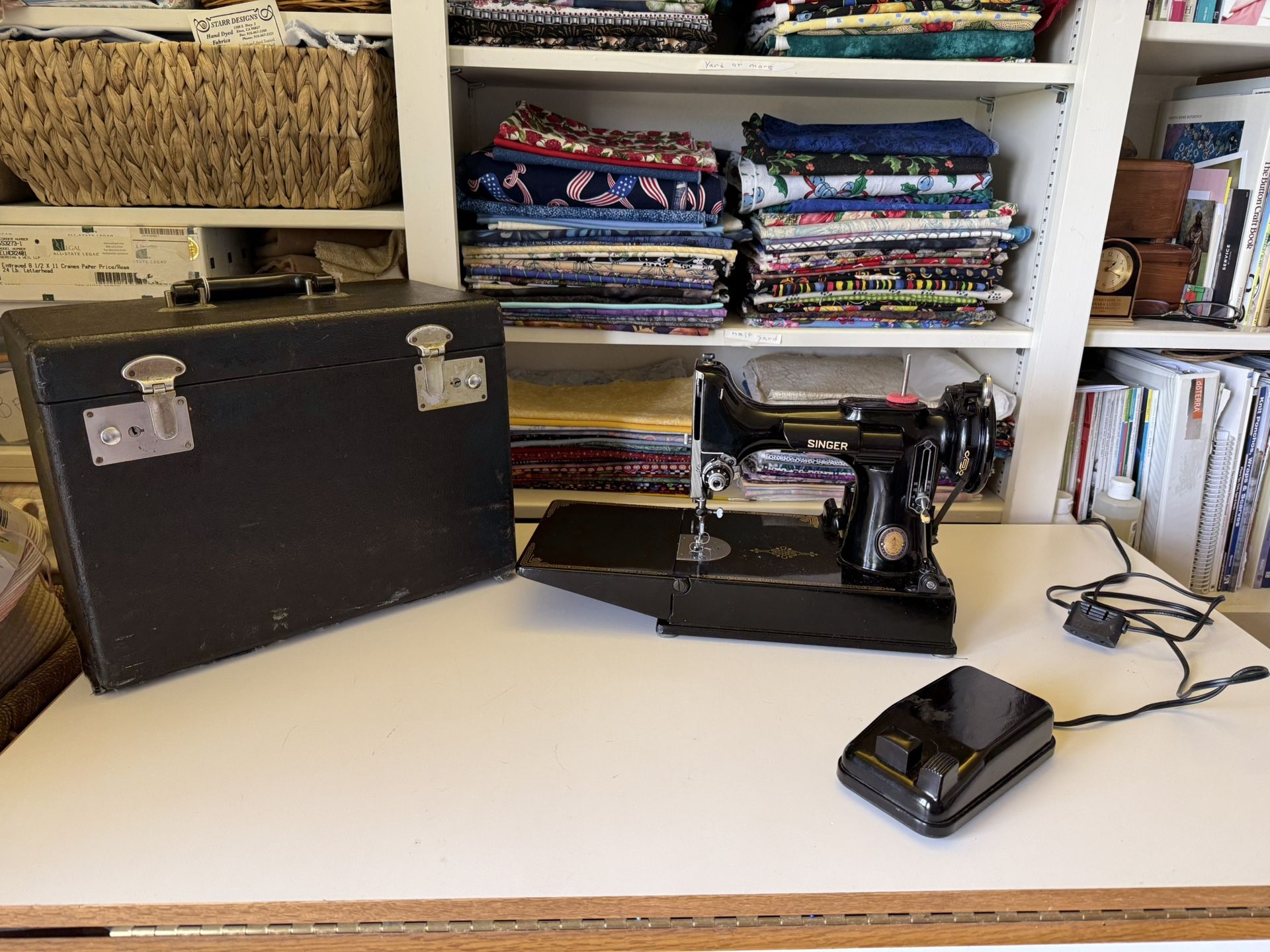This is the real deal! Complete with its original carrying case and a button hole attachment with the full set of size guide pieces. And… it works great!!! My mom loves sewing so used this machine when traveling in her motorhome. It’s the perfect gift for anyone who loves to sew and collects antiques!