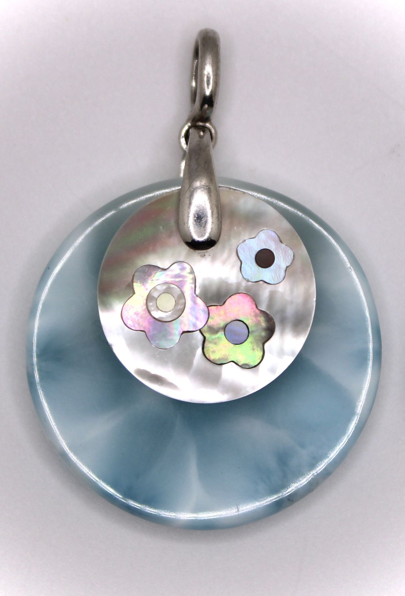 Sterling Silver Abalone and Mother of Pearl Pendant with Flower Inlays - stamped 925 with a trademark. This exquisite sterling silver pendant features a stunning combination of mother of pearl and abalone, adorned with delicate flower inlays. Measuring 1 3/16 inches in width and 1 5/8 inches in height (including the bail), this pendant is both elegant and unique. The back side showcases a 925 stamp and a trademark, ensuring its authenticity and quality. **Details:** - Width: 1 3/16 inches - Height (including bail): 1 5/8 inches - Materials: Sterling silver, mother of pearl, and abalone - Markings: 925 stamp and trademark - Condition: very good vintage condition - Perfect for: Adding a unique touch to any jewelry collection, gift for a loved one This pendant is a perfect accessory for any occasion, adding a touch of elegance and charm to your outfit. Contact me for more information or to arrange a purchase.