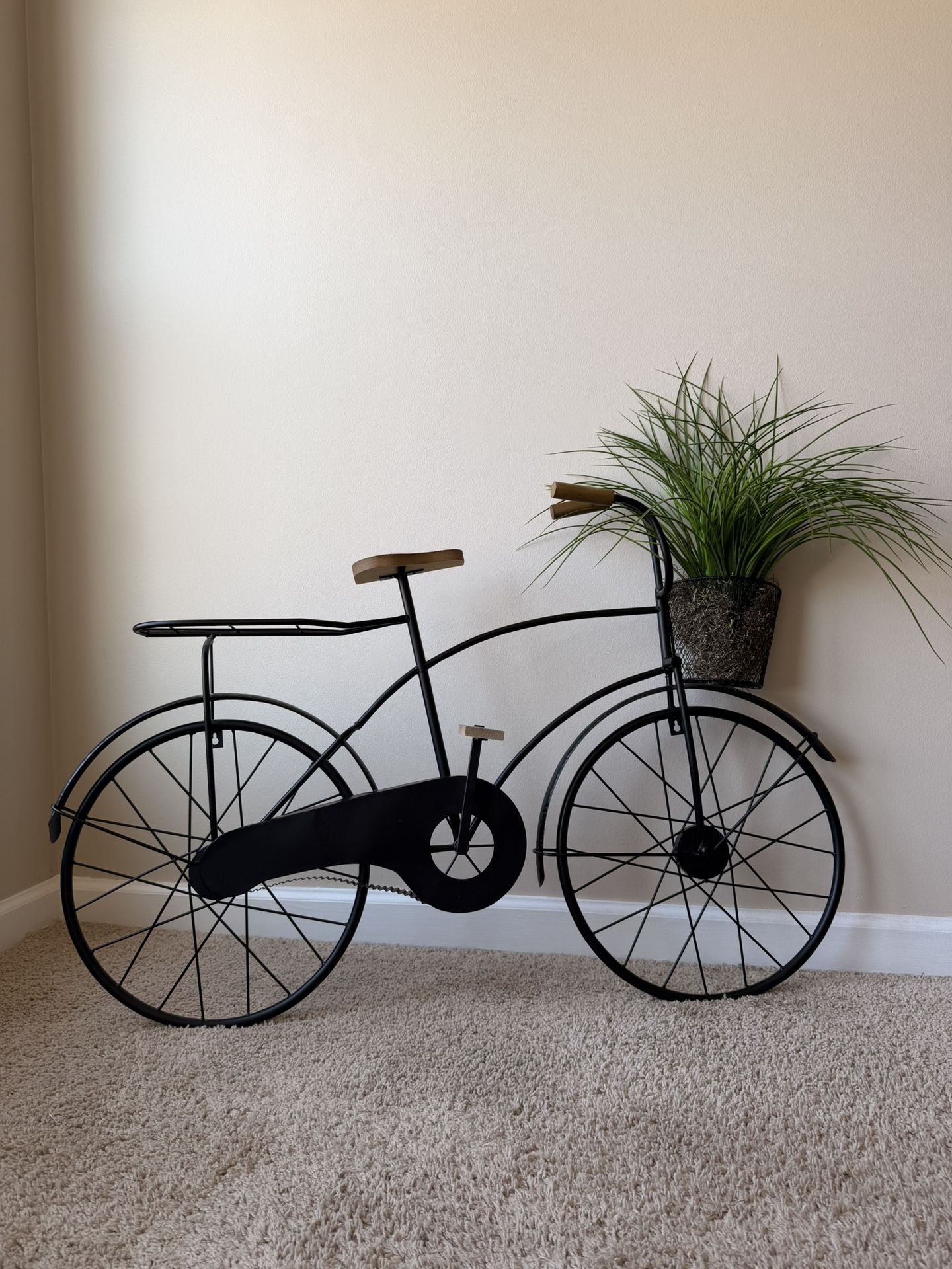 New Condition - Metal decorative bicycle with planter basket. Black metal frame with wood accents on the seat and handlebars. Great for holding a plant or as a unique home or porch decoration. Size 40x27 $30 OBO