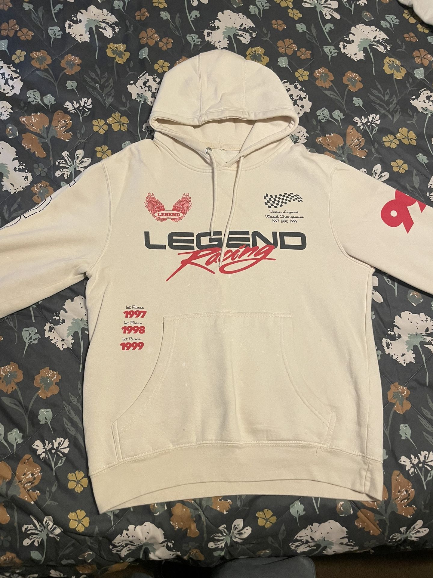 in good shape size M has a small stain on the right side oh the arm sleeve