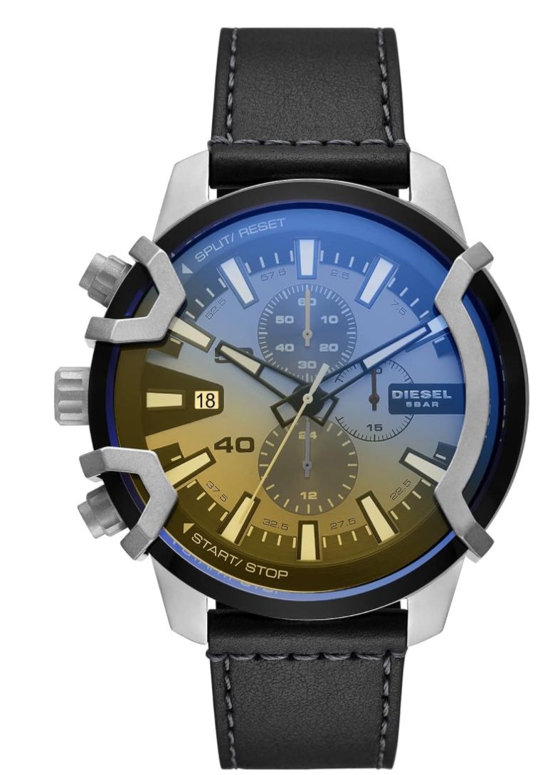 Brand new watch with box Bold, ironic and never shy, Diesel doesn't follow trends; it creates them. With a distinctive look and a unique voice, Diesel constantly moves style forward. The perfect balance of grit and refined sophistication - Griffed takes style to a whole new level. Roll bar-inspired clips wrap around the case to give an industrial look, while also protecting the beautifully shaped crystal and eye-catching dial. Case size: 48mm, Band Size: 22mm; quartz movement with chronograph analog display, three subdials, date window, and stopwatch functionality; iridescent mineral crystal face resists scratches