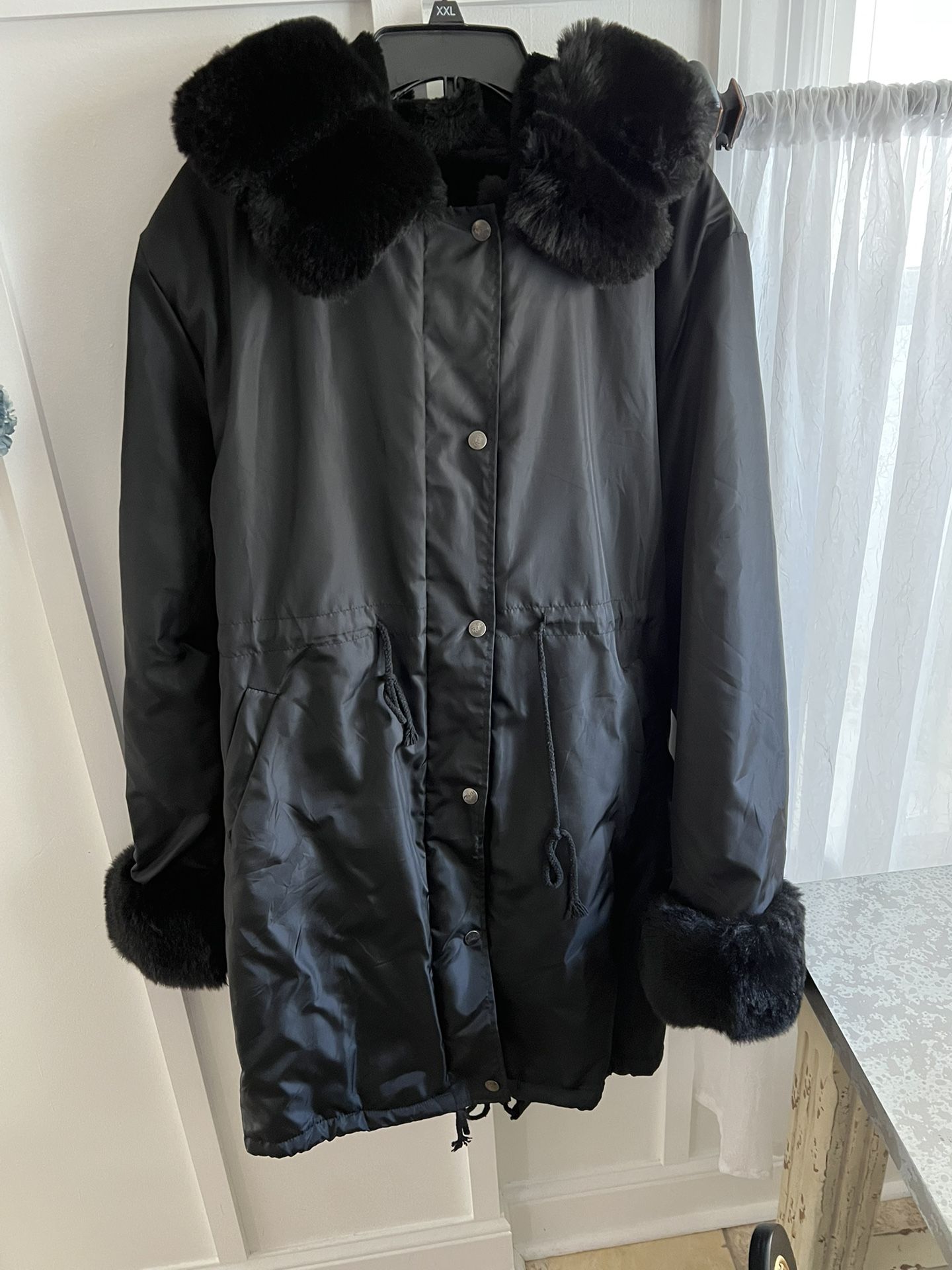 Women’s coat large. 65% polyester 30% cotton. Snap buttons fur lined ( Not Real Fur) has hood. Nice warm coat in excellent condition.$35