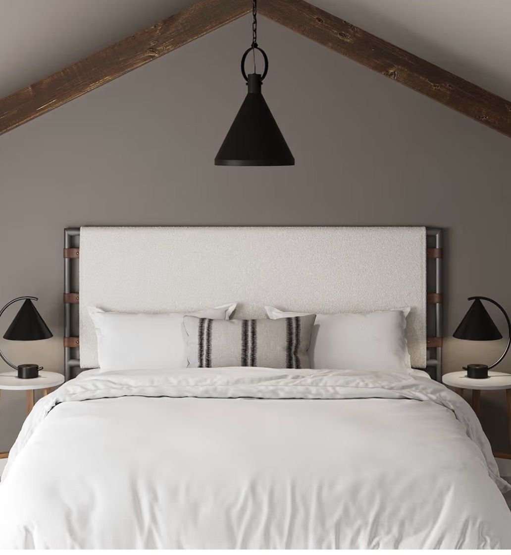 Condition: New in Box Message me your availability for pickup. Modern Nathan James Aspen King Headboard featuring soft bouclé fabric and sleek metal framing. • Mid-century modern design • Bouclé upholstered panels • Faux leather accent straps • Gunmetal metal frame • Fits standard king bed frames • Easy assembly