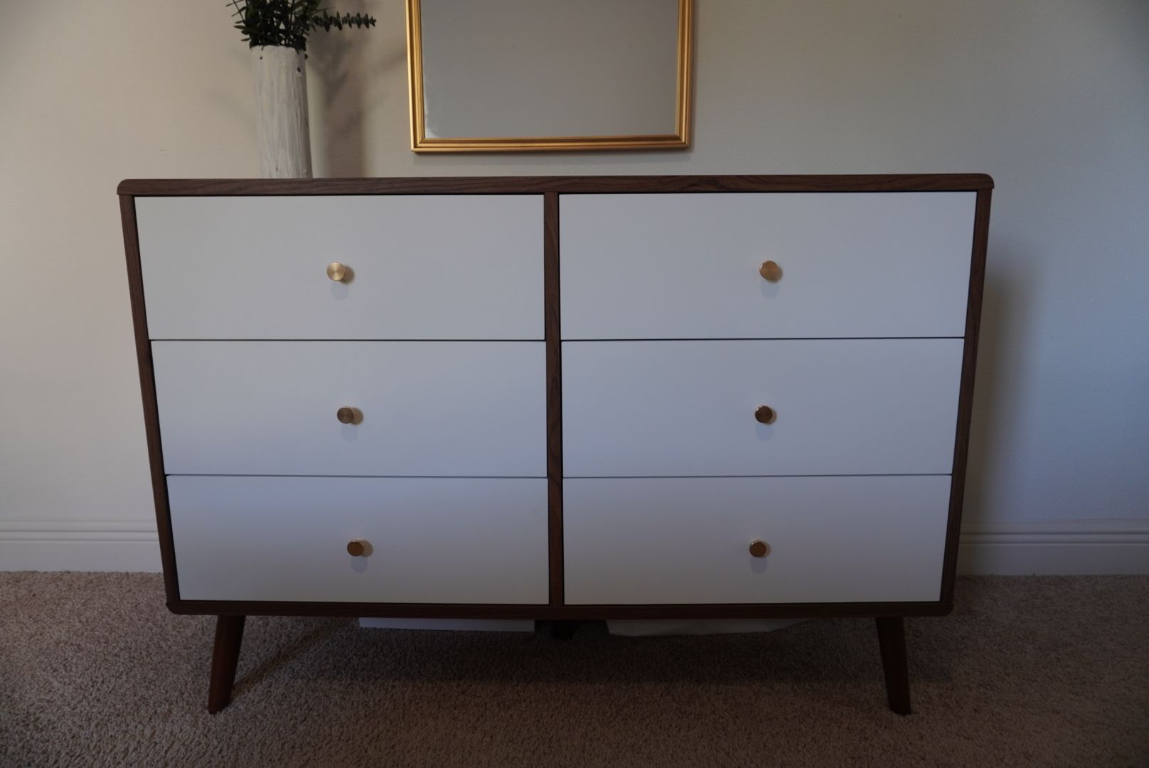 Selling a beautiful mid-century modern 6-drawer dresser in excellent condition. Used like new and very well maintained. Walnut wood finish with white drawer fronts and gold chrome knobs, also have silver to change. Tapered wooden legs give it that classic modern look. Sturdy, solid, and spacious. Details: • 6 roomy drawers • Smooth roller glides • Clean walnut grain finish • White lacquer-style drawer fronts • Tapered mid-century legs • Strong and stable Dimensions: 32.5” H x 47” W x 20.5” D Weight: 116 lbs Perfect for a master bedroom, guest room, or apartment. Plenty of storage while keeping a clean, modern aesthetic. No scratches or damage. $250. Pickup in Boca Raton. Message me if interested.