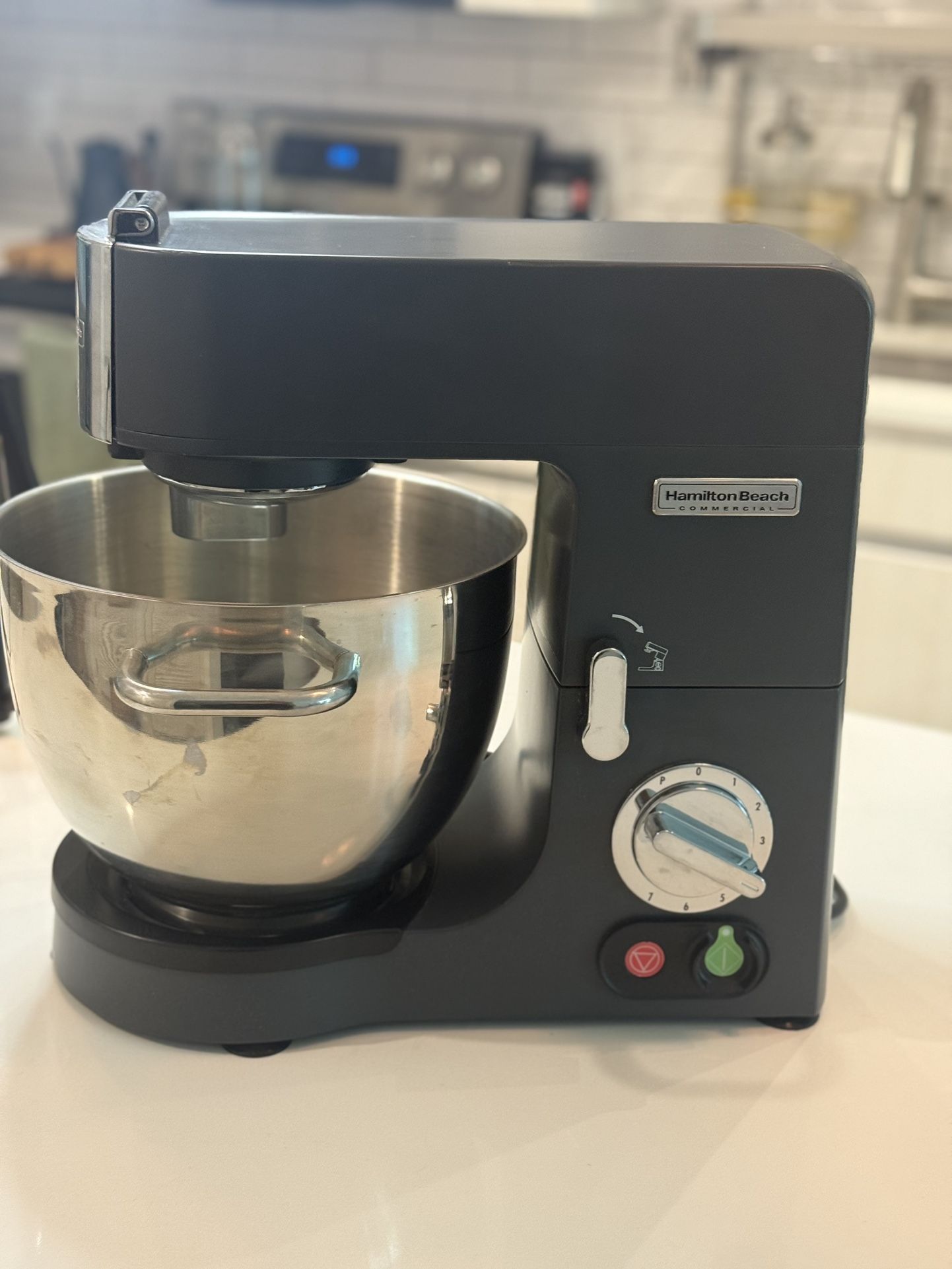 Hamilton Beach Planetary Mixer 8qt CPM800 ($950 New) For versatility, the Hamilton Beach CPM800 planetary mixer includes a dough hook, beater, and wire whisk. Each of these components, along with the bowl, are made of stainless steel for durability and resistance to rust and corrosion. The bowl accommodates 8 quarts and has handles on each side to help employees lift and carry it. This unit is operated with a start/stop button and a variable seven-speed dial and pulse, and the speed can be adjusted during the mixing cycle without damaging the components. The Hamilton Beach CPM800 commercial mixer's body is made of strong aluminum. It fits on a countertop and is positioned on rubber feet to prohibit sliding. To add ingredients, change attachments, and scrape the bowl's sides, the head of the body tilts back. Withstanding frequent use, the gears have a metal construction, and overall, this mixer measures 134/5 inches wide by 164/5 inches deep by 154/5 inches high. Product Details • 8-qt. capacity • Countertop model • Variable 7-speed controls with pulse function • Start/stop buttons • Tilt-back head • All metal gears • Stainless steel bowl, dough hook, beater, and wire whisk • 2 handles ease bowl lifting • Durable aluminum body • Positioned on rubber feet Dimensions & Utilities • 134/5 in. W x 164/5 in. D x 154/5 in. H • 7 A, 800 W • 120 V/60 Hz/1 ph