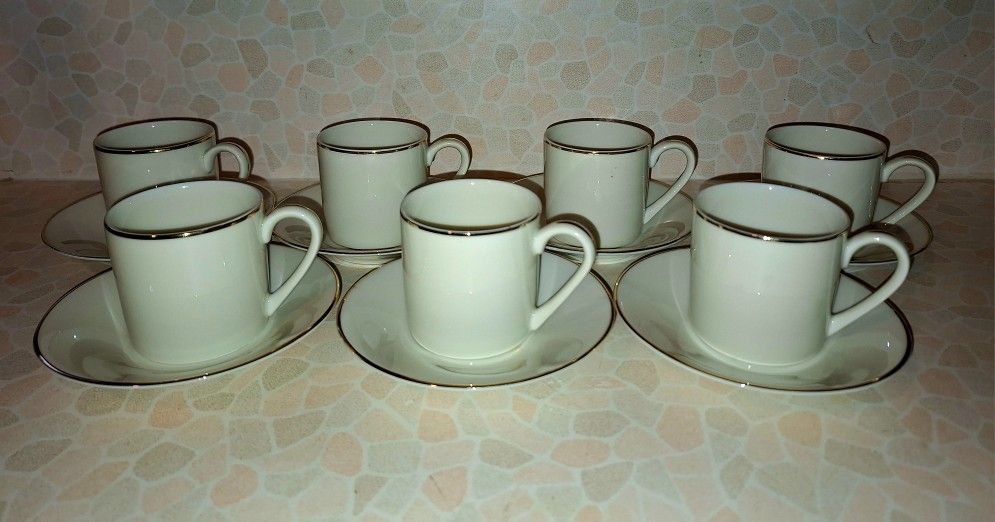 Gold rimmed set of 7 cups and saucers. Smaill, 2.3" tall. Asking $10 obo for all