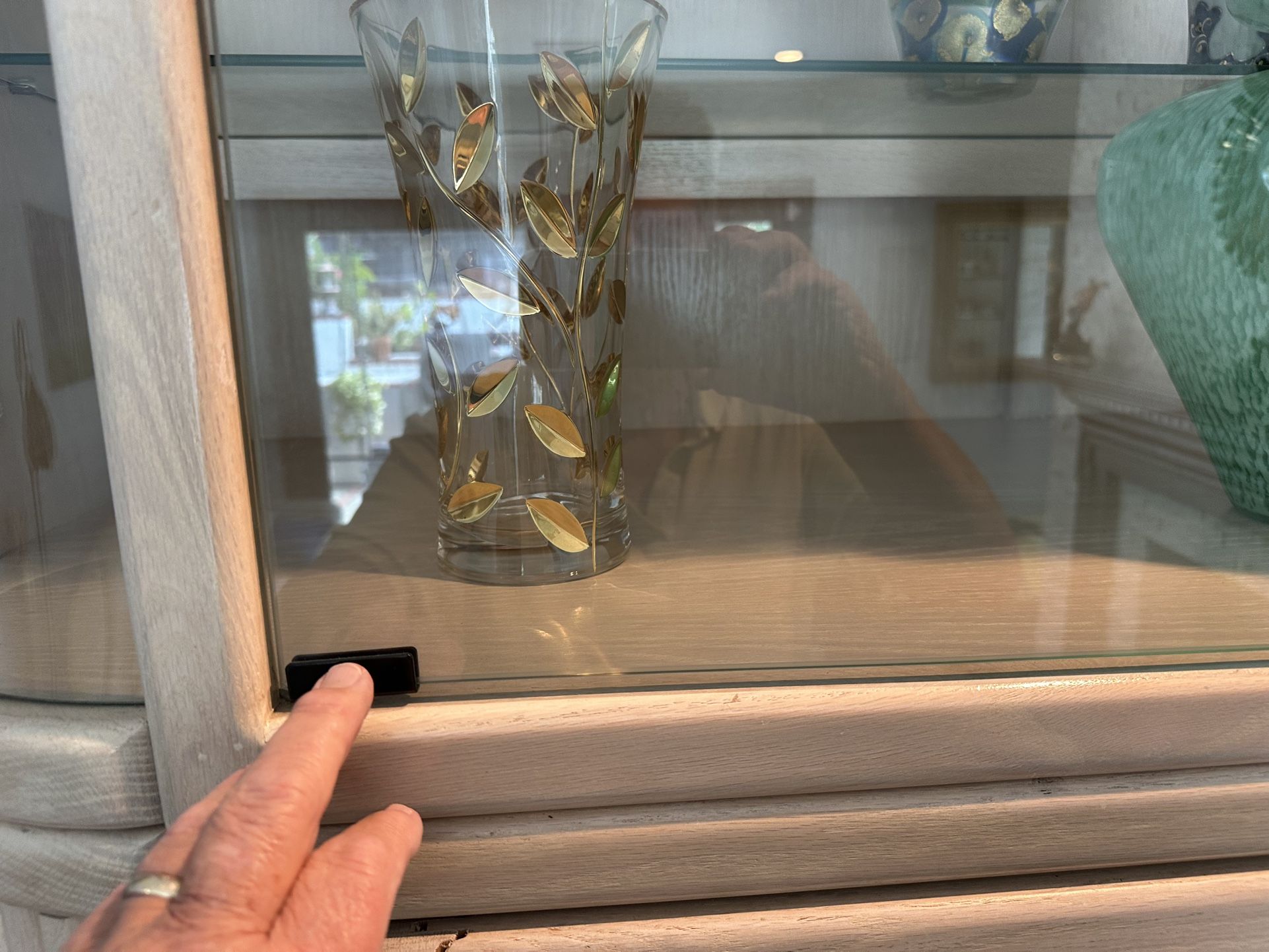 this is free to anyone that wants to come get it. It’s a beautiful unit. It is 60 inches wide 77 inches tall and 21 inches deep. Touching the glass door turns on the light. There are three levels of brightness.