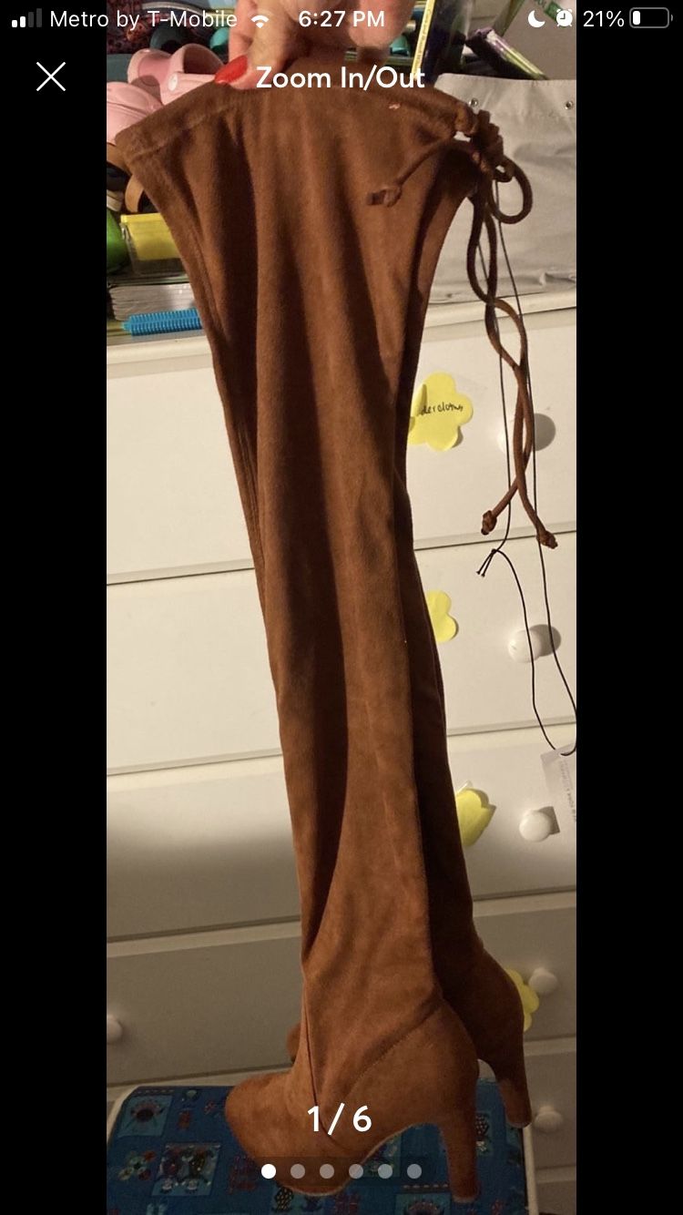 NWT. I got injured and never got the chance to wear them. Photos do no justice. About 3.5-4in heel. Faux suede material. Size 7. Camel color. Perfect for this fall/winter or even Halloween. Questions let me know. Need gone ASAP. Will be posting more heels.