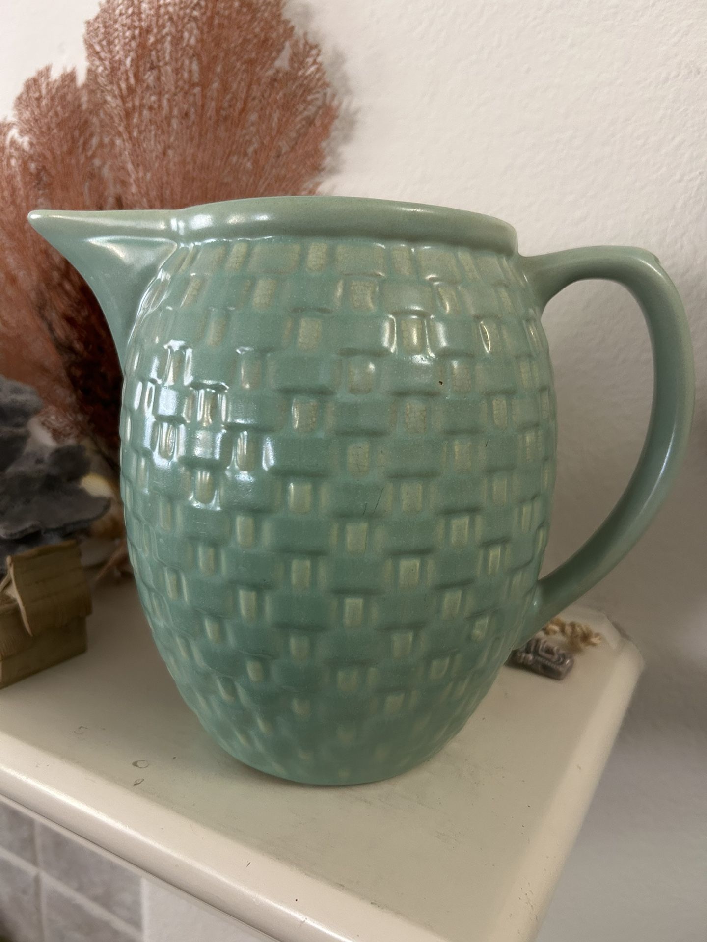 Vintage Weller Pottery 7” Teal Basketweave Pitcher. Has some wear on the bottom. Pick up in Placentia.