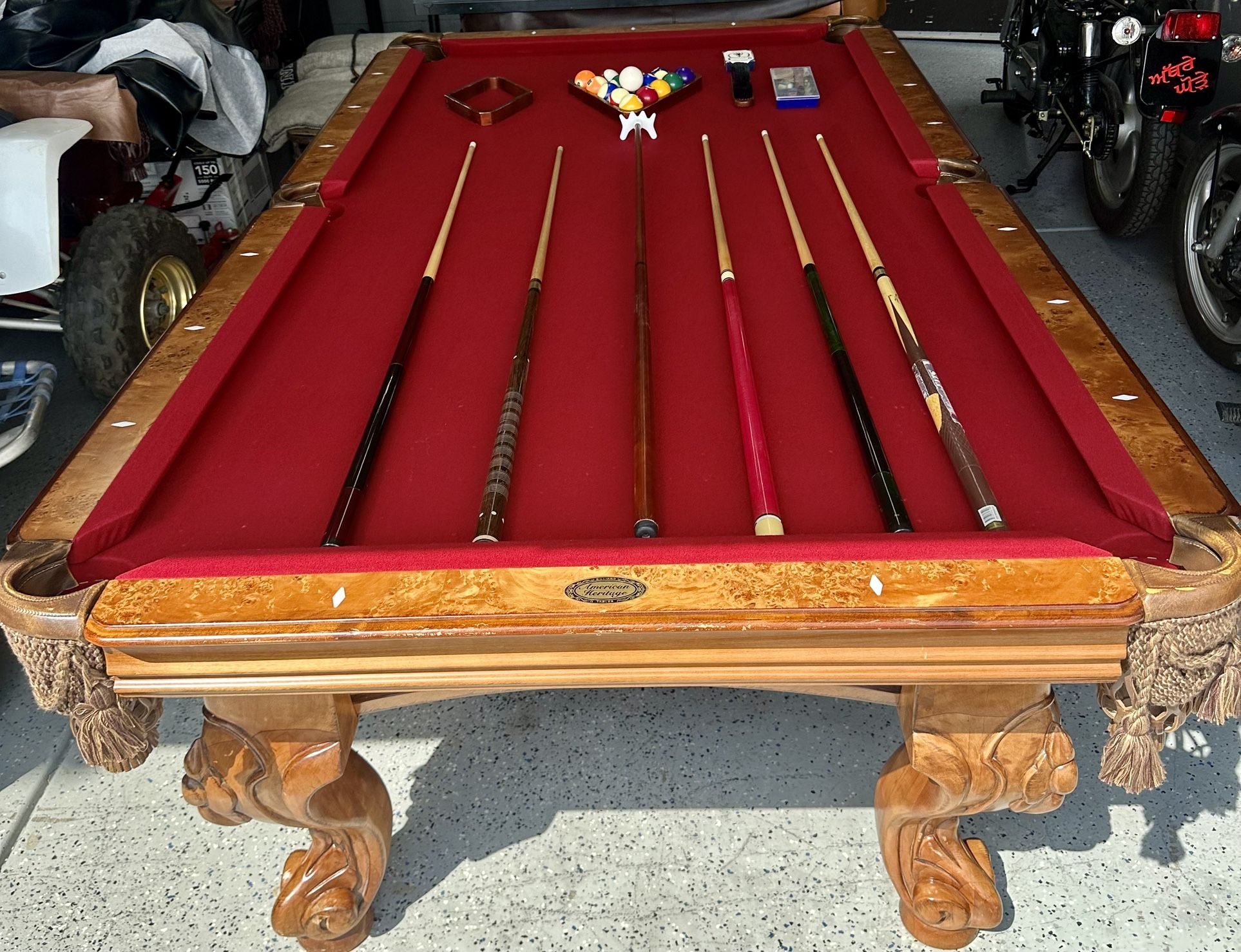 8 Foot Slate American Heritage Pool Table Felt and body are in great condition and comes with everything in pictures. Balls, sticks, triangle, diamond, chalk, brush, cover, bridge, etc… $2200 delivered