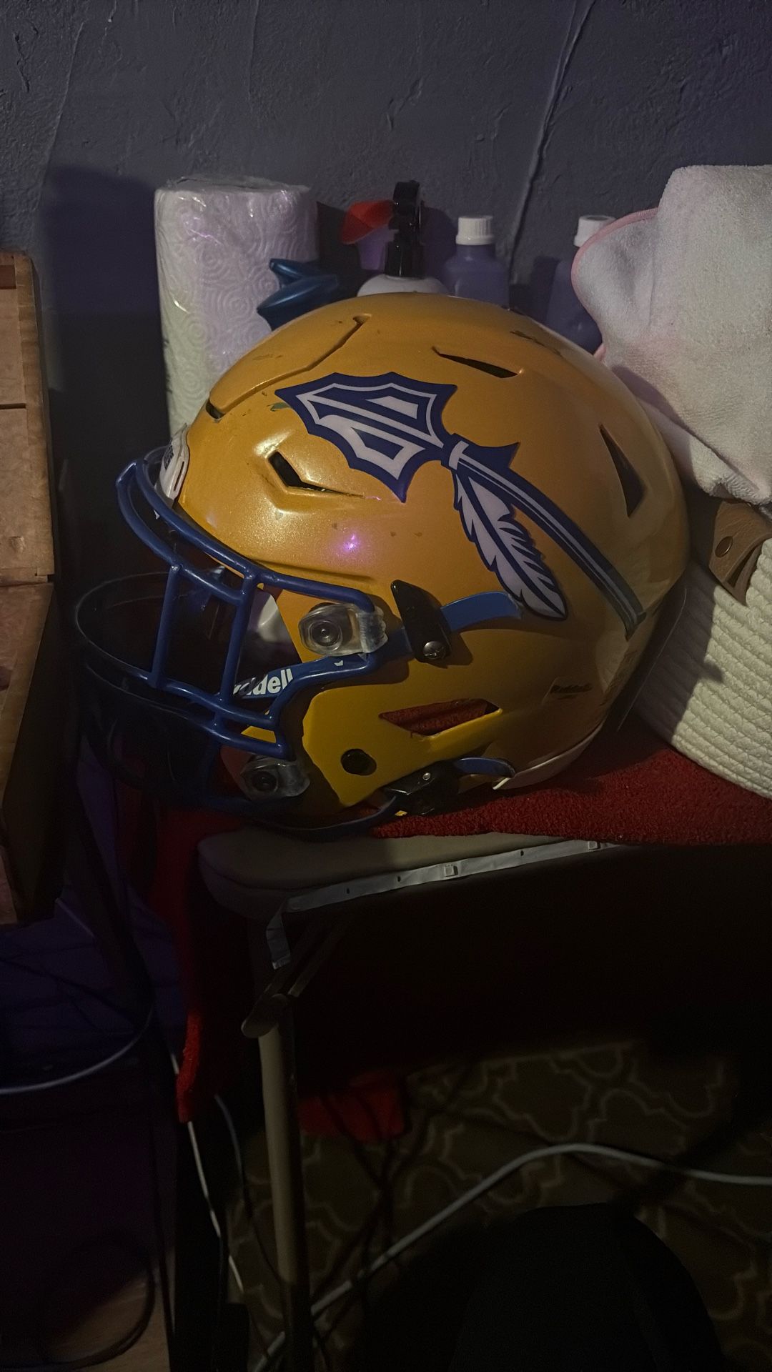 Yellow with blue facemask football helmet