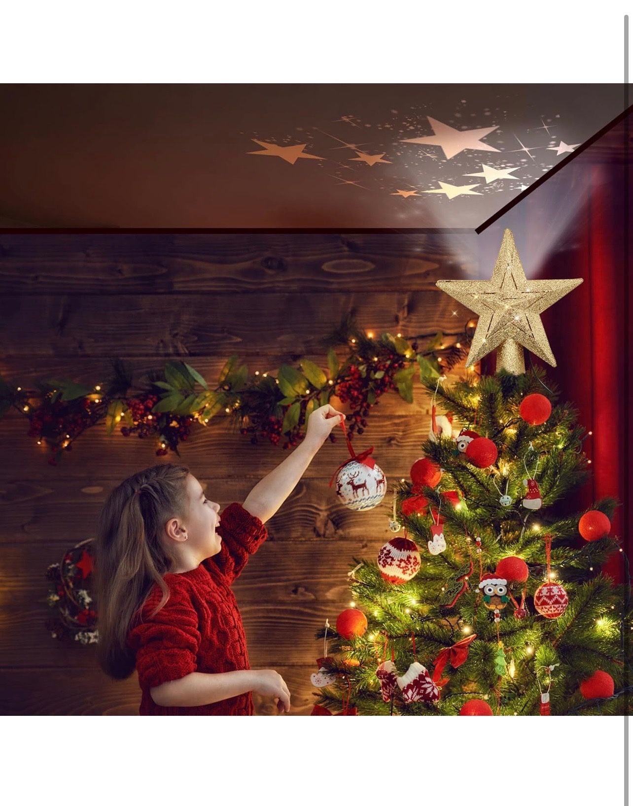 BRAND NEW IN BOX Christmas Tree Topper Lighted with 3 Pattern Projection Modes,3D Flash Dynamic Projector for Christmas Decorations,Christmas Star Tree Topper with Built-in LED Rotating Motion Light.(Gold) • MAGICAL 3D DYNAMIC ROTATING PROJECTOR: Golden Christmas tree star finial projector with 3D skeleton design, classic pentagram appearance design, glittering gold dust adds luxury magic to the Christmas tree topper; the projection pattern dynamically rotates and flutters on the ceiling, decorating the top of the Christmas tree and making your Christmas tree sparkle. • 3 SWITCHABLE DYNAMIC PROJECTION MODES: Christmas star tree topper with dynamic lights, change film for different scenes, 3 projection modes: snowflakes, stars, Santa Claus, dynamic patterns on your ceiling for an exciting light show! • EASY TO DECORATE: Simply install the base of the Christmas tree top star projection light on the top of the Christmas tree and adjust it to the right angle, then plug it into the power supply, the power cord is 9.8 feet long (the power cord adopts the USB interface with USB adapter), where there is no power outlet, you can use the mobile power supply to power it, after powering on, turn on the switch the projector will project the fantastic dynamic stars. • UNIVERSAL SIZE: The Christmas tree topper star projection light ornament measures 9.8 inches (H) x 9.4 inches (L) x 3.6 inches (W), suitable for all different sizes of Christmas trees, no need to worry about mismatch with the size of the tree, the 9.8 feet USB plug cable is also enough to connect the star projection light tree ornament to the power source with ease, it's the perfect Christmas tree decorations. • BEST CHRISTMAS TREE DECORATION: The gold shell sprinkled with gold glitter sparkles clearly at night, even under lights. Both sides of the star lights are completely covered with gold glitter and the front and back are equally beautiful. The star projection tree topper lights make your Christmas tree more perfect and make your Christmas tree more cozy and festive in winter Christmas. • PERFECT CHRISTMAS GIFT: The gold glitter Christmas tree topper star projector light can be used as a Christmas tree decoration, or as a Christmas gift for your family, lover, friends, coworkers, and as a rotating LED night light projector for children