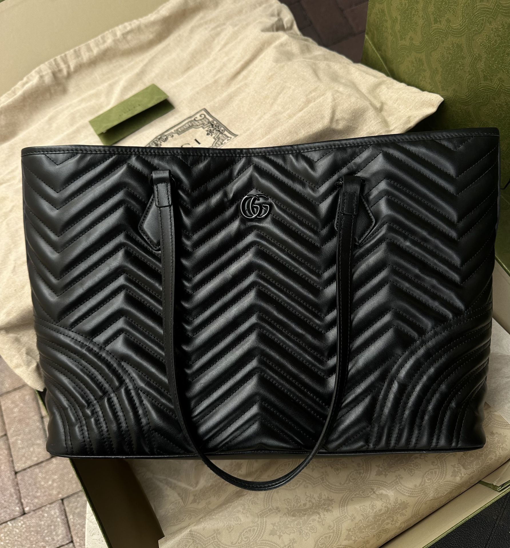 Purchased at Gucci Boca Raton. This bag is in like-new condition — no stains, no odors, no peeling, no corner wear. FULL SET INCLUDED: • Gucci shopping bag • Gucci gift box • Dust bag • Care cards • Tissue & packaging • Original Gucci receipt This is the large GG Marmont chevron tote in black leather with black hardware — timeless, elegant, and extremely spacious. This exact style is still one of Gucci’s most in-demand totes. Retail: $1,890+ My Price: $1,250 (firm for now due to condition & full set) Willing to negotiate Safe meetup only. Cash • Zelle • Apple Pay accepted.
