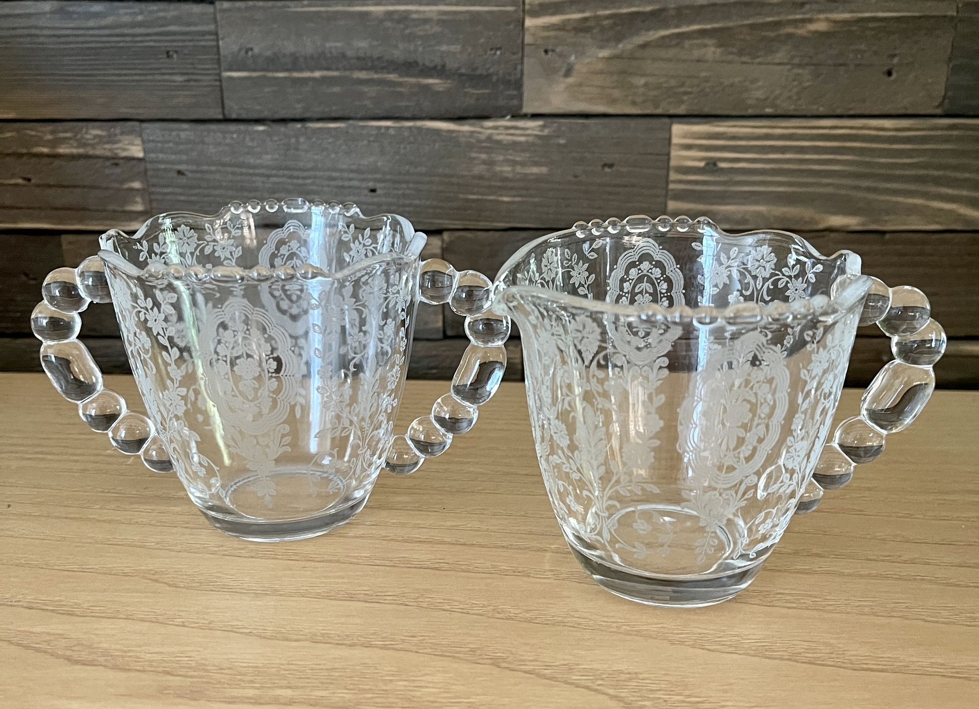 Beautiful vintage Tiffin Franciscan open sugar bowl and creamer in the etched June Night pattern with beaded handles. Produced from the early 1940’s to the mid 1960’s. In excellent vintage condition. No chips or obvious flaws.