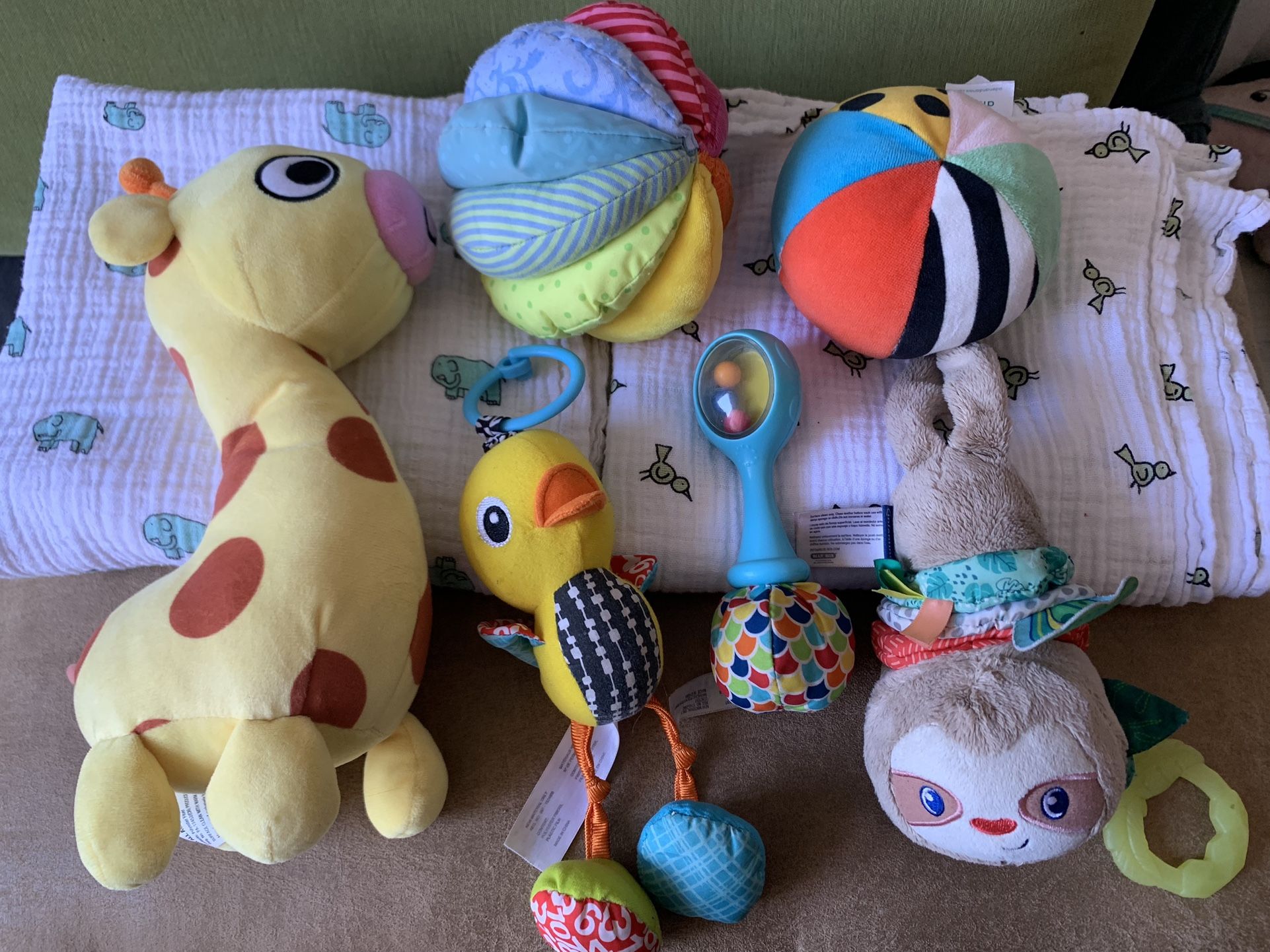 Two newer blankets, duck toy vibrates when pulled, sloth is a music box when pulled. All recently cleaned. Asking $10 pick up in El Cajon.