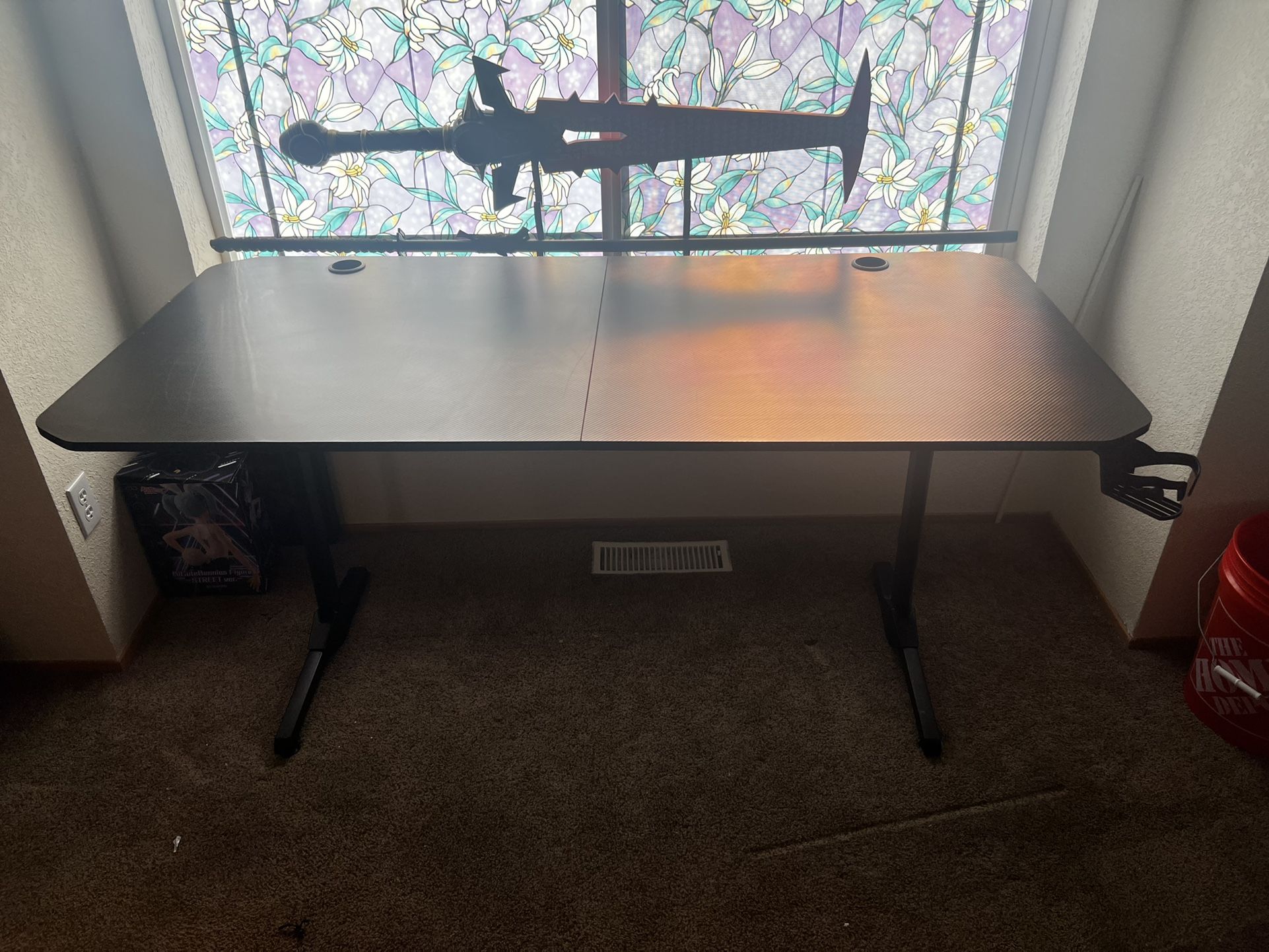 Large gaming desk, top comes off into two parts. Missing one of the feet on the back left side, but nothing else is missing. 62 1/2 inches long, 29 1/2 inches wide