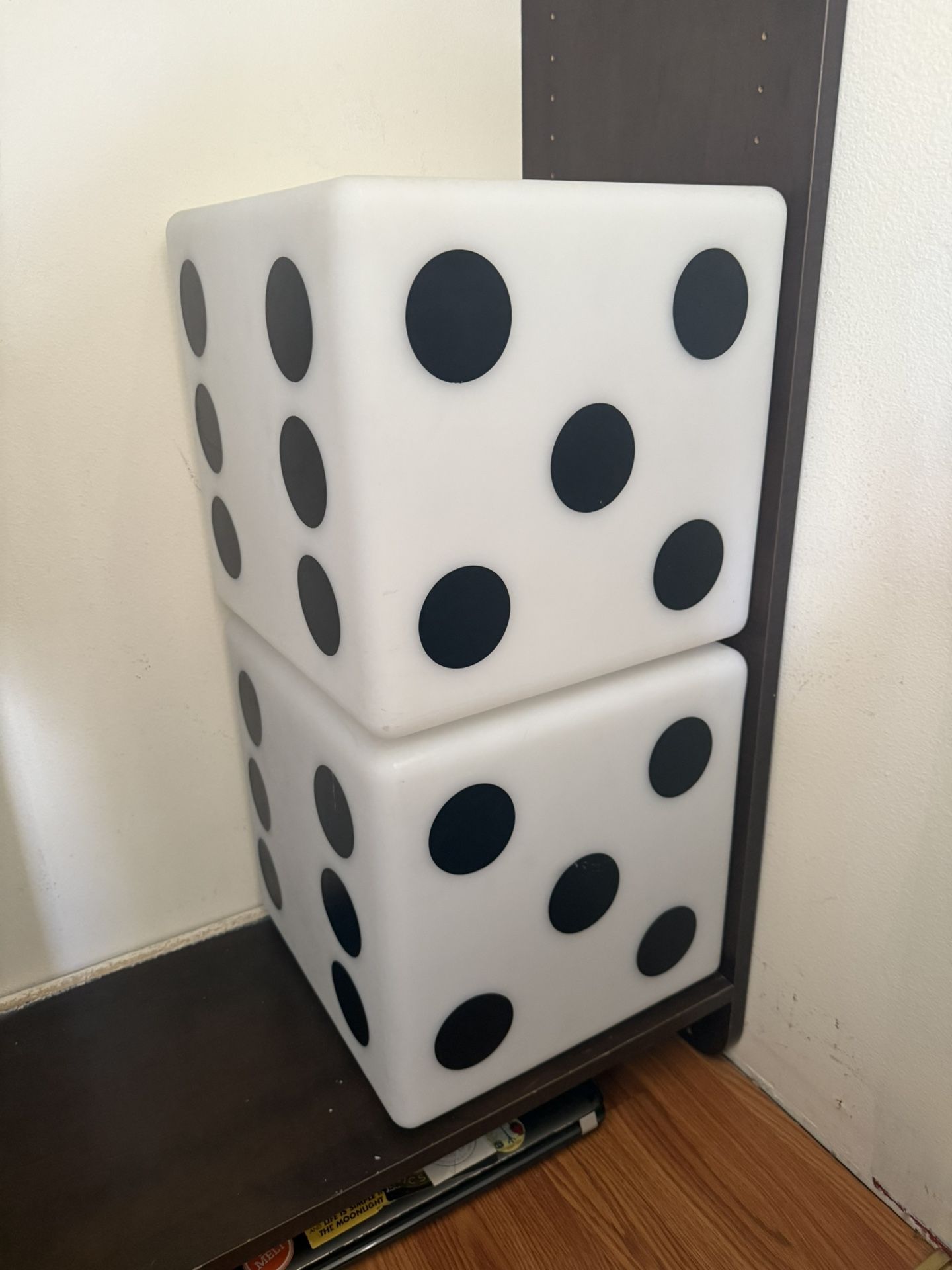 pair of giant dice. work as lights but need battery changed. i used them as small night tables so fairly sturdy. no scratches or scuffs. 12 L x 12 W x 12 H