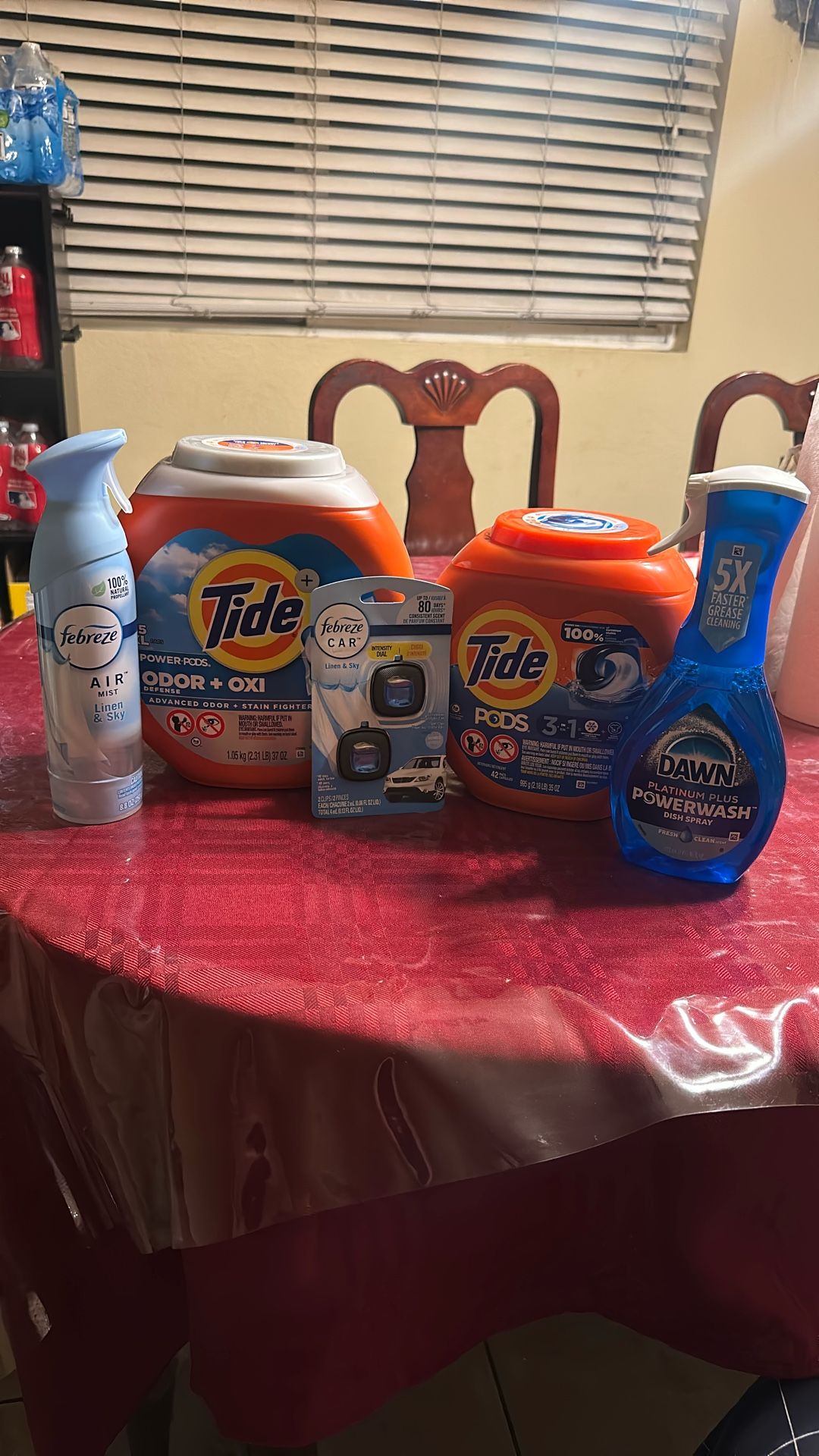 Includes: Tide 25XL pods, Tide pods 42 count, Febreze air mist, Febreze car air freshener clips (2 count), and Dawn power wash dish spray. All new.