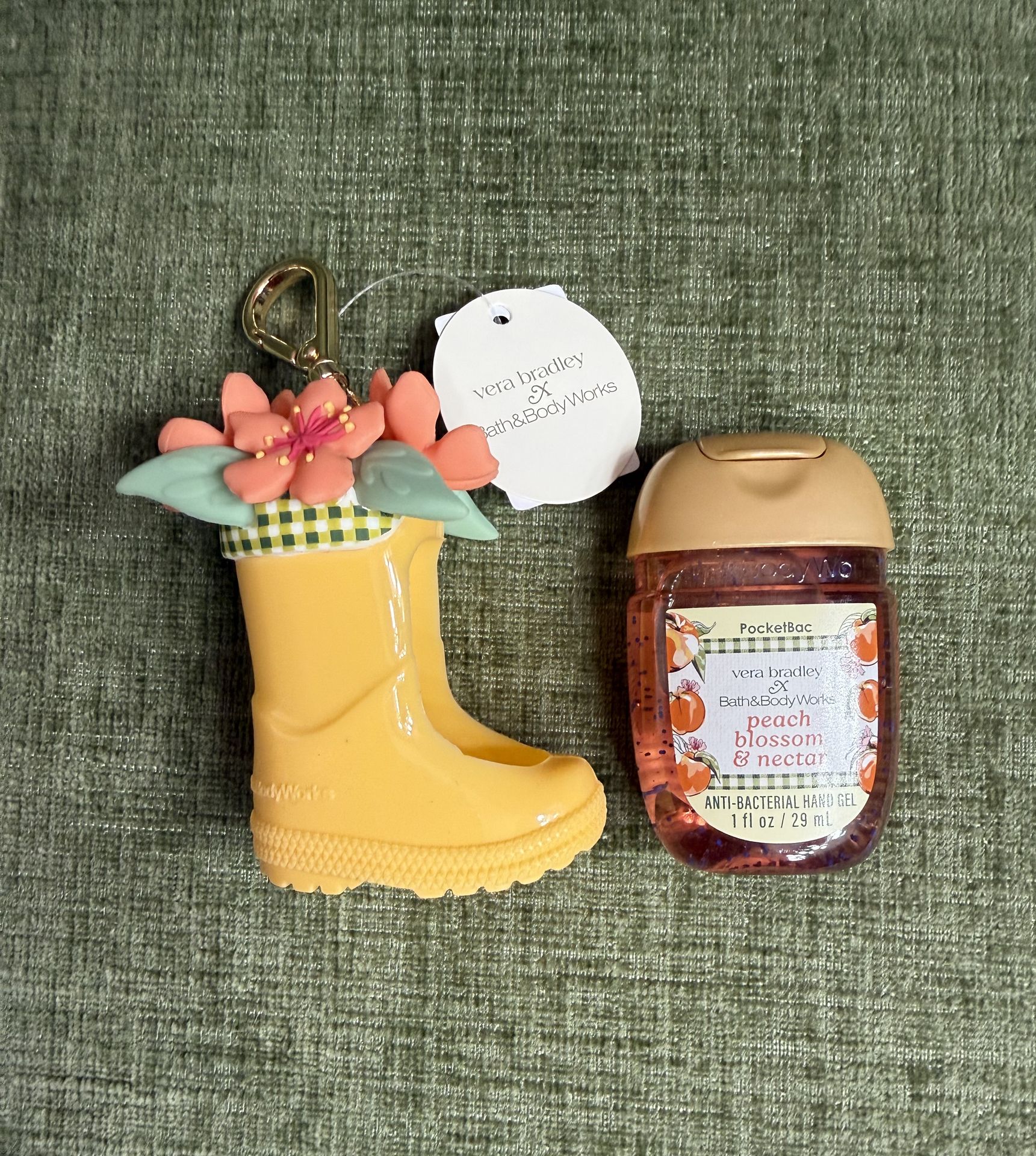 Brand new with tags! 2 piece set includes new Rain Boot holder and new peach blossoms and nectar scented sanitizer. Sold as a set only. FIRM price $15