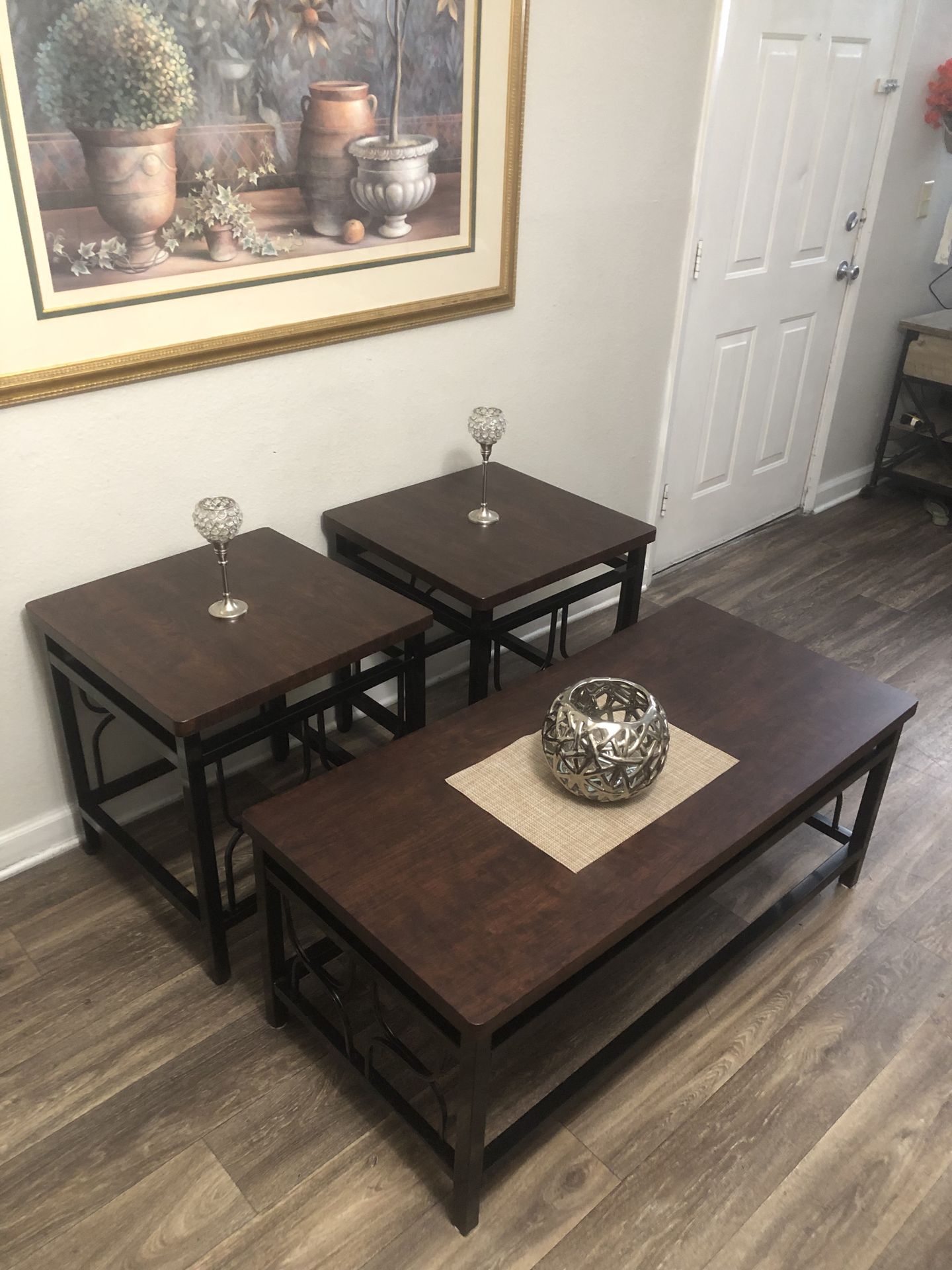 Excellent condition like new Very sturdy No scratches The coffee table 22 * 48 inch 20 inch high The end tables 22 * 22 inch 24 inch high Delivery available for gas fees Cash only please thank you