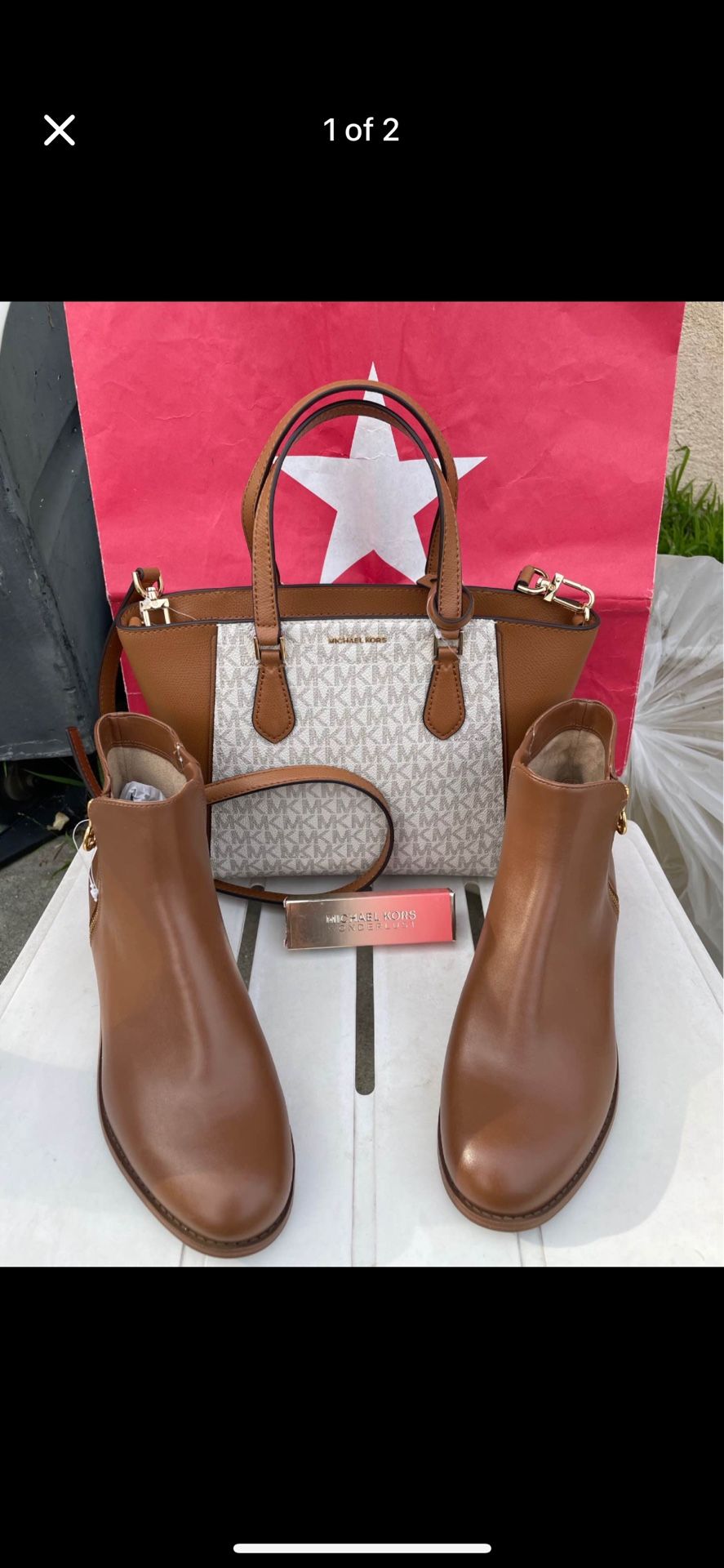 Michael Kors Taryn Small Signature Logo and Leather Convertible Crossbody Bag NWT Michael Kors heel ankle boots- Women's - Black/Brown size 8 (No Box) I will provide a Michael Kors dust bag Michael Kors Wonderlust roller perfume NIB pick up location in the city of Pico Rivera