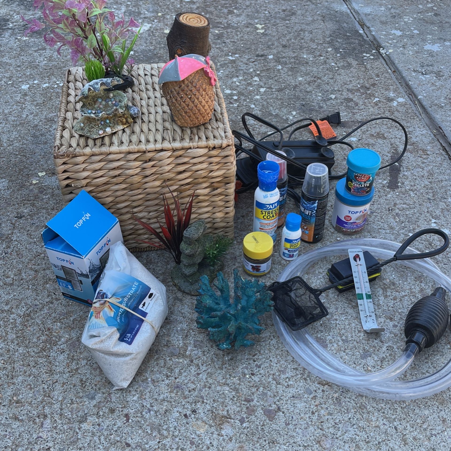 6 decorative accessories for tank plus aquatic substrate, fish food, net, thermometer, siphoning hose heating element