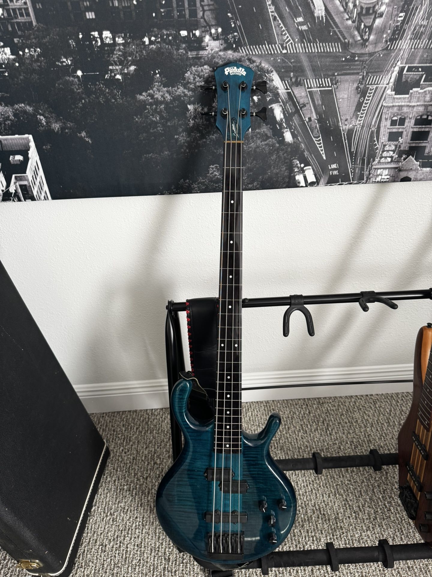 Vintage 1992 Pedulla USA Signature buzz fretless PJ Bass Teal Turquoise flame top-gold hardware. Bartolini pick ups Great round tone Awesome highly sought-after bass model ever since Mike's retirement. This model has become now, one of the most coveted instruments for the hard working-gigging musicians, They're beautiful sounding instruments.