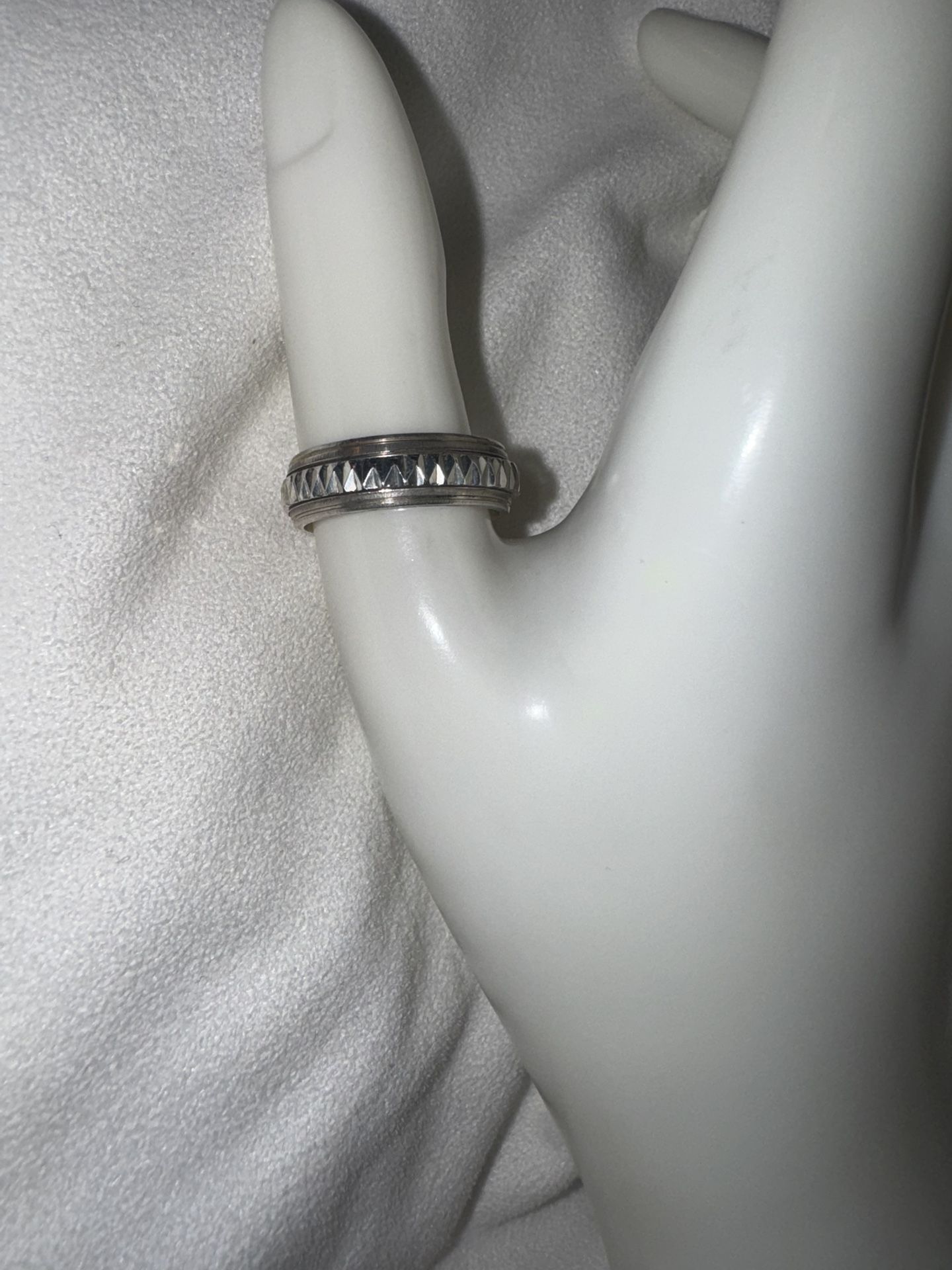 This is a sterling silver spinner ring, also known as a worry or fidget ring. It features a wide band with a central, textured segment designed to rotate independently.