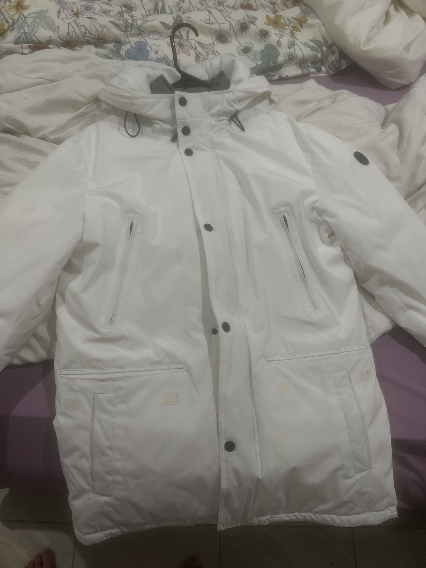 ‘Men’s’ M.. I’m a women’s Large and fits me well. Unisex in my opinion. Goes down to just about my knees (5’5). Worn once because it’s white and I’m a mother, lol. Lost the hood when I took it of so, it’s not included. Purchased for Upstate NY winters, not of use here in NV. Located near Boulder station off Sahara / S. Walnut. Can meet, will ship.