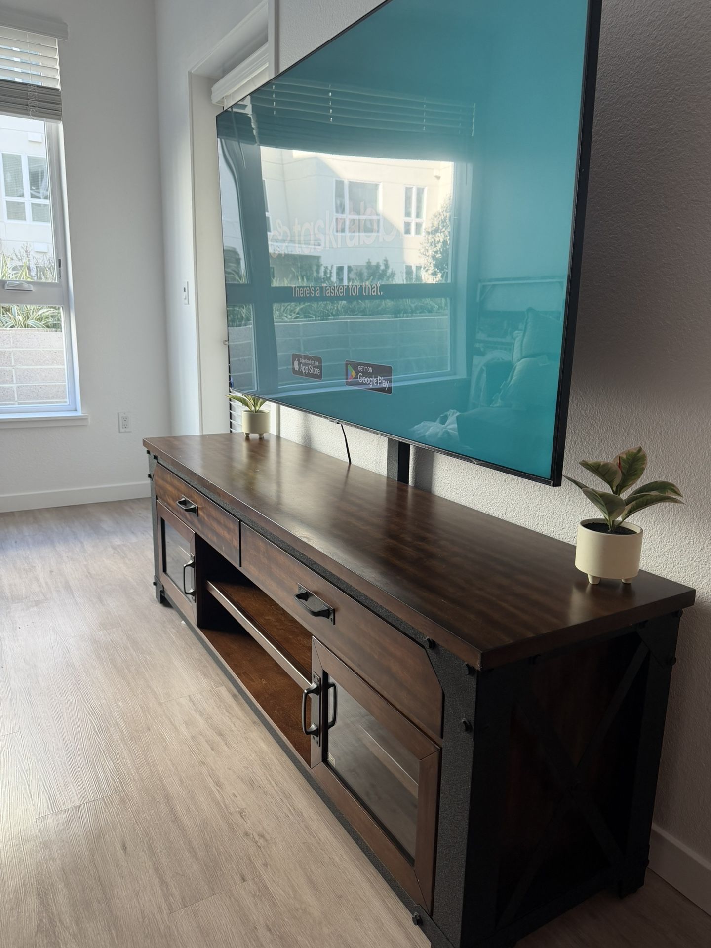 TV stand purchased at Costco for 400 It’s heavy and in great condition. Couple scratches.