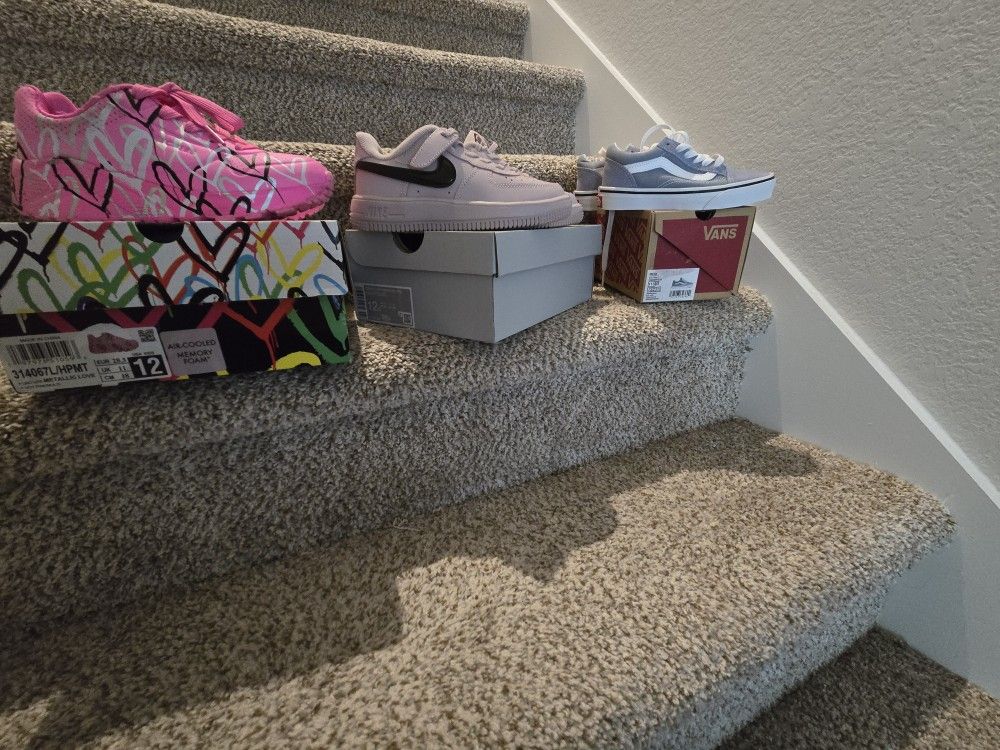 Brand new just in time for Spring : Vans for Kids, new in the box. Color: Baby Blue Size: 11.5c $25 Brand new Nikes for kids. Beautiful blush pink color Size:12c $40 Kids Metallic heart Skechers. These kicks have air cooled memory foam, for busy little feet. Worn once. Size: 12c Color: Pink with metallic hearts $20 Can be purchased separately or all 3 for $80
