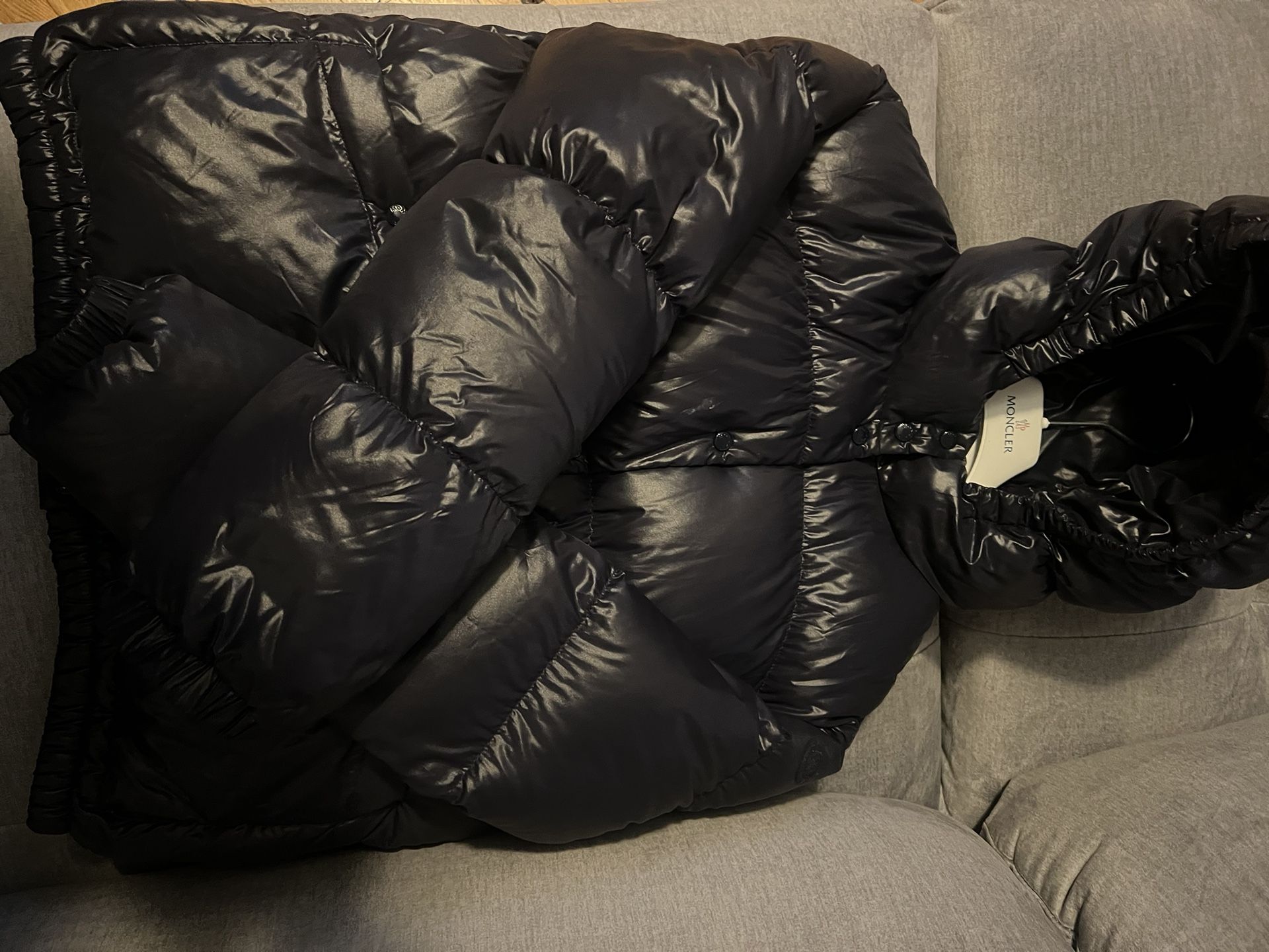 Navy blue boys size 14 MONCLER. 100% authentic. No stains, rips, or tears. My son simply outgrew the coat. Purchased from MONCLER store not even 4 months ago. Purchase tag and hanger included. Don’t have receipt but can probably look up purchase in my bank statement if that’s what’s needed.