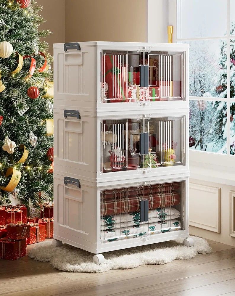OlarHike 48QT Lockable Storage Bins with Lids - Folding Storage box with Doors and Wheels, Collapsible Plastic Storage Bins for Closets, Stackable Storage Organizer, Storage Containers, 3 Pack Cubes