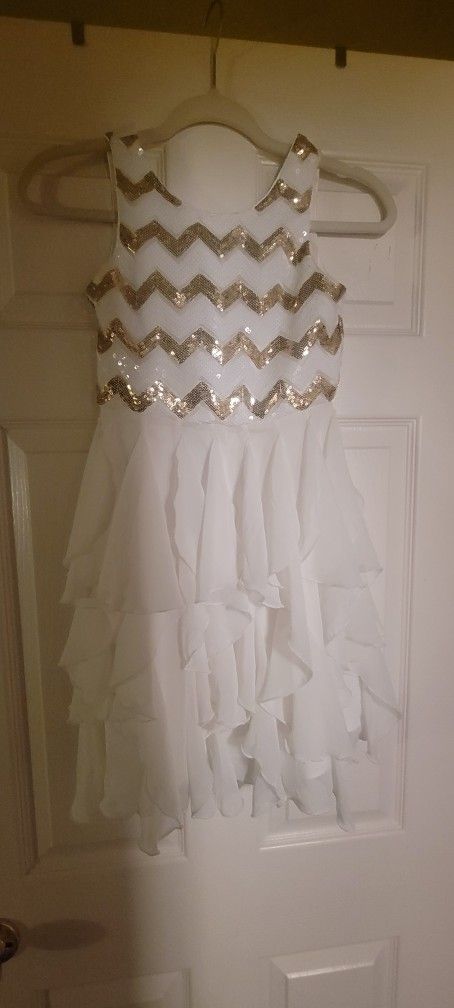 Says size 10 but fits more as a size 8 (my daughter is slender but tall) White with gold sequins Sleeveless, zipper back Excellent condition, worn only twice Pick up South Temecula