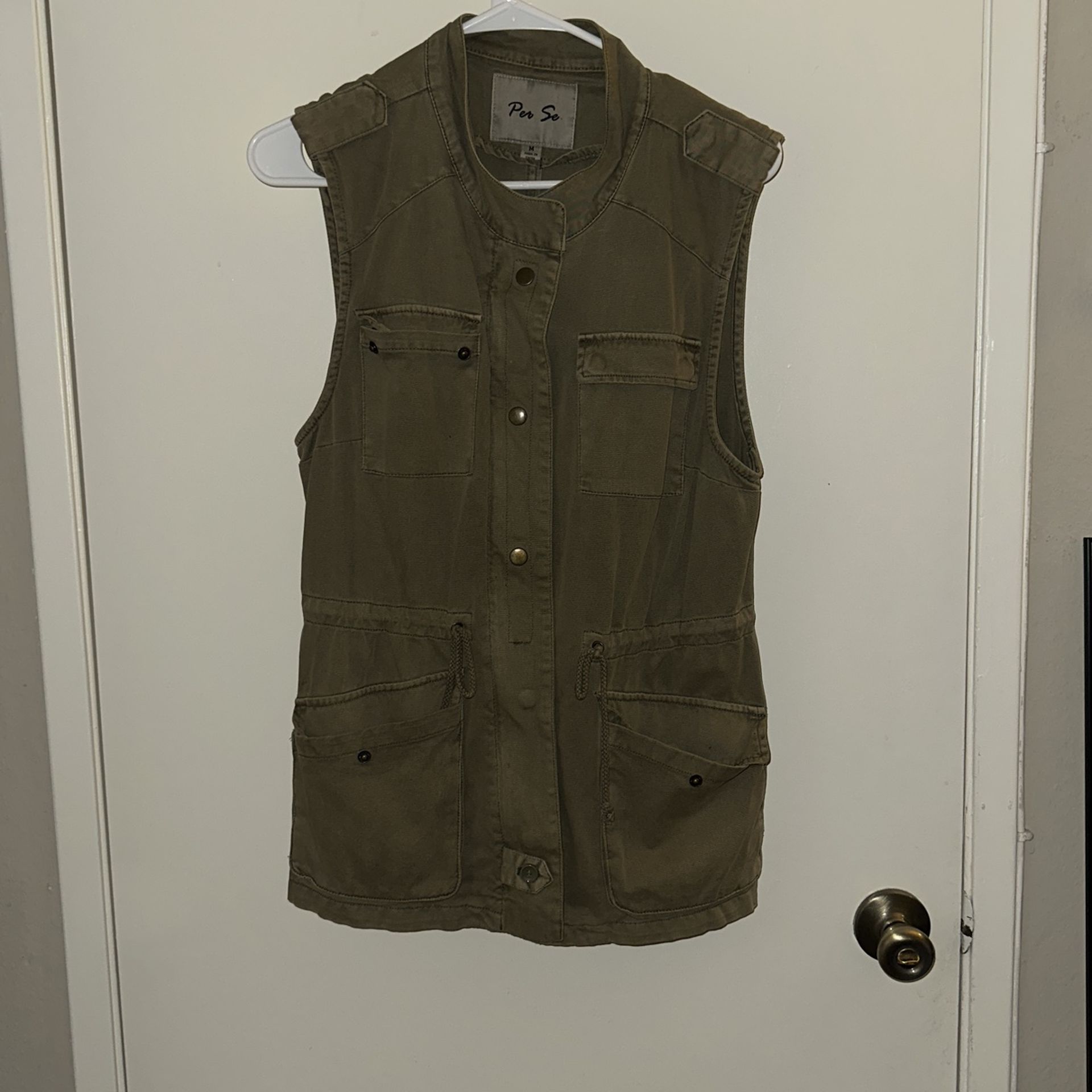 Green combat-looking vest. Only worn a couple times. Medium (not thick nor thin) material. Has lot of pockets in the front. Keeps you warm! SAN DIEGO PICK UP ONLY! Needs to be gone by this weekend (2/01)!