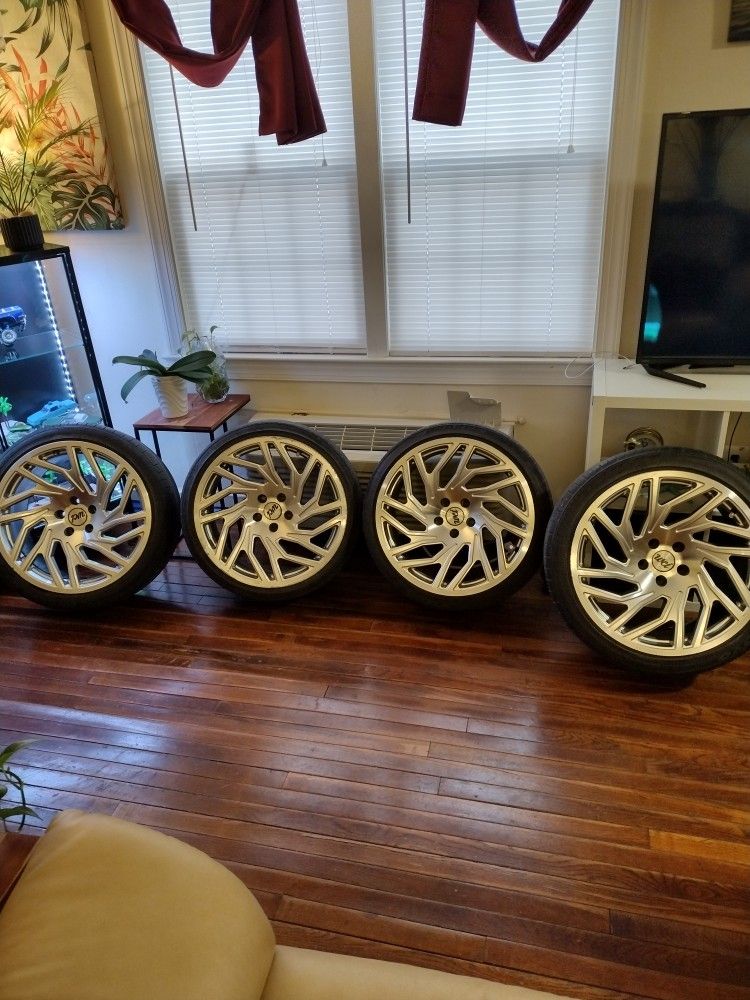 19x10 squared set of wci wheels +30 offset. Tires need to be changed soon but still hold air. Lug pattern is 5x114.3 All 4 have Minor rashes but they clean up pretty nice No cracks, repairs, or bends at all. Estos rines son difíciles de encontrar en 5x114.3 y en 19x10 mucho más difícil así que si no saben mejor no tiren ofertas estúpidas.