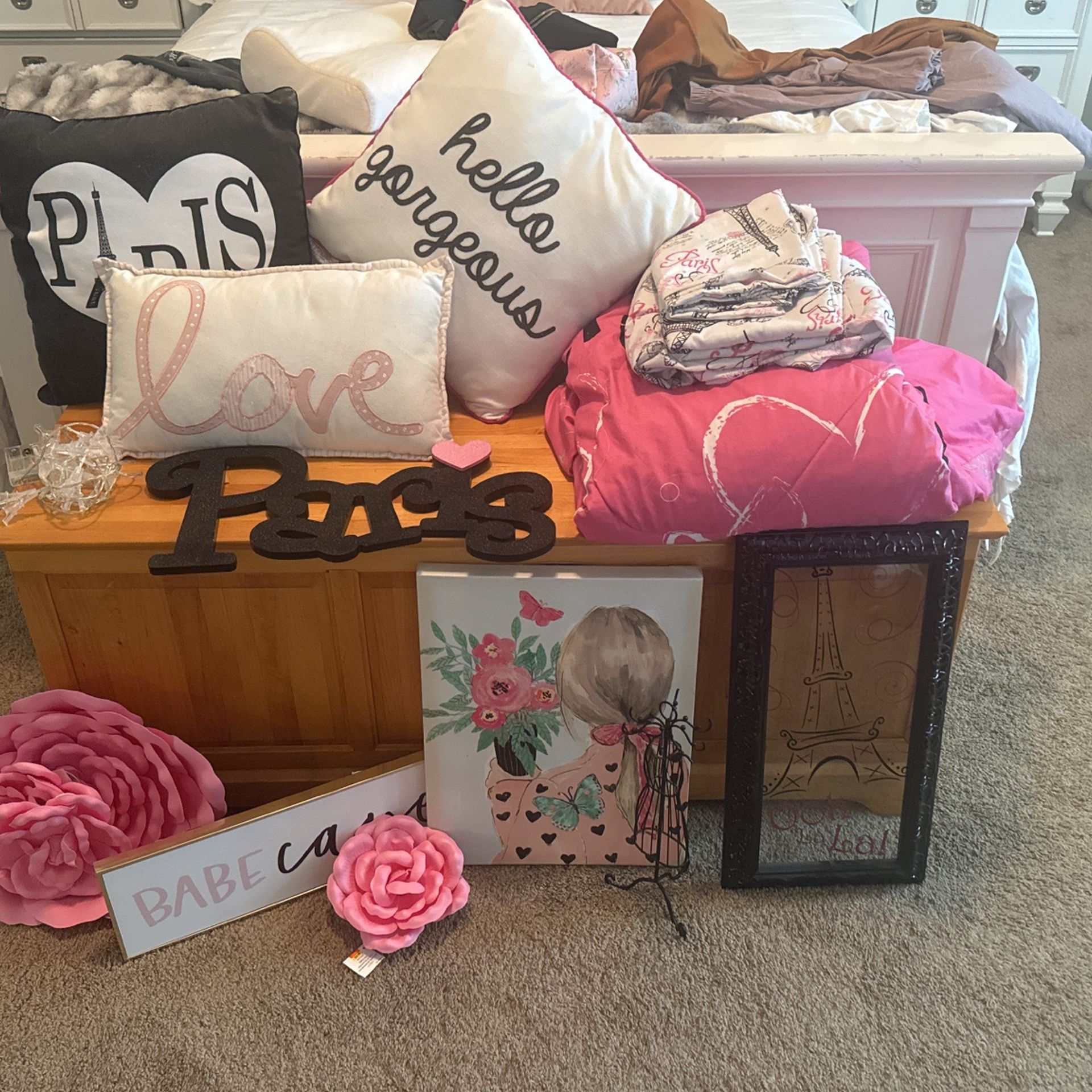 Want a Paris themed room we have all you need. Sheets and comforter for a twin size bed. String lights are working. All wall decor is in perfect condition.