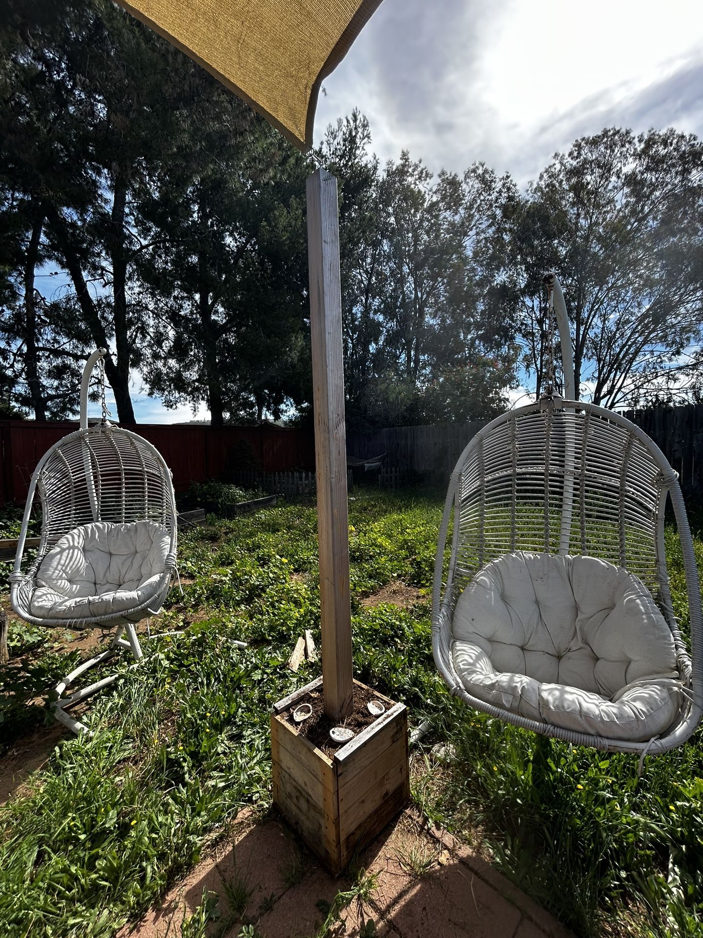Old outdoor hanging chairs. Could use some tlc. There’s some rust and a lot of the original plastic wrapping is breaking off. The cushions are dirty but in good condition otherwise.