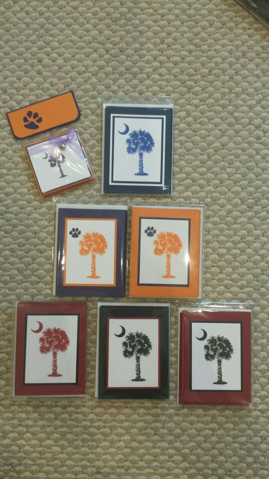 Handmade cards measure 4.25" x 5.5" with 5 cards per pack. Notepad measures 3.5" x 3.5" and has a purple ribbon with a tiger paw charm. Cards are stamped with the Palmetto State logo, have white paper inside on which to write, and come with 5 envelopes. Whether for a Clemson fan or USC Gamecock, these make great gifts. Various colors and more are available. $4 per pack of cards $4 for the notepad