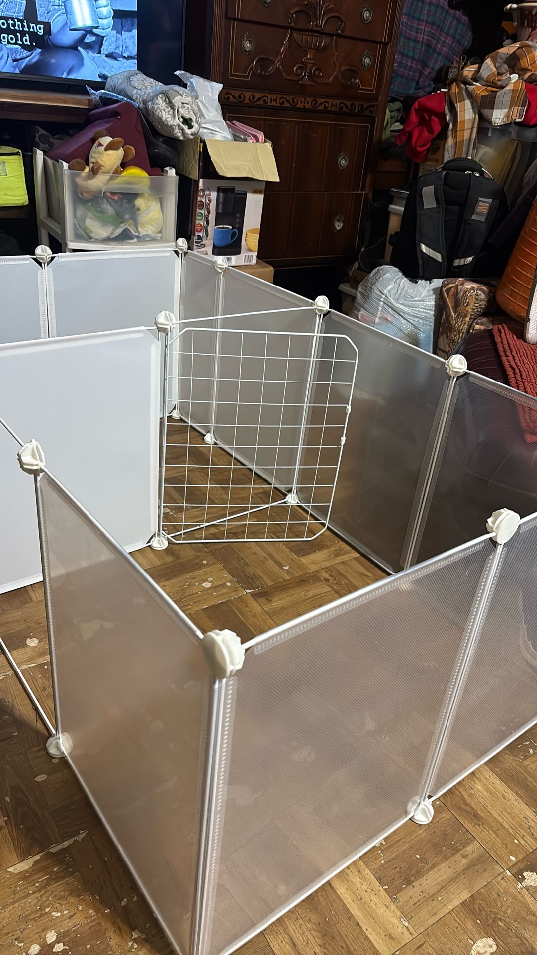 This kennel is a 2 in 1. Dogs/puppies can be separated. One side is clear and one side is solid. I bought it for my yorkie when she has her pups but it won’t fit in my room. Never been used.