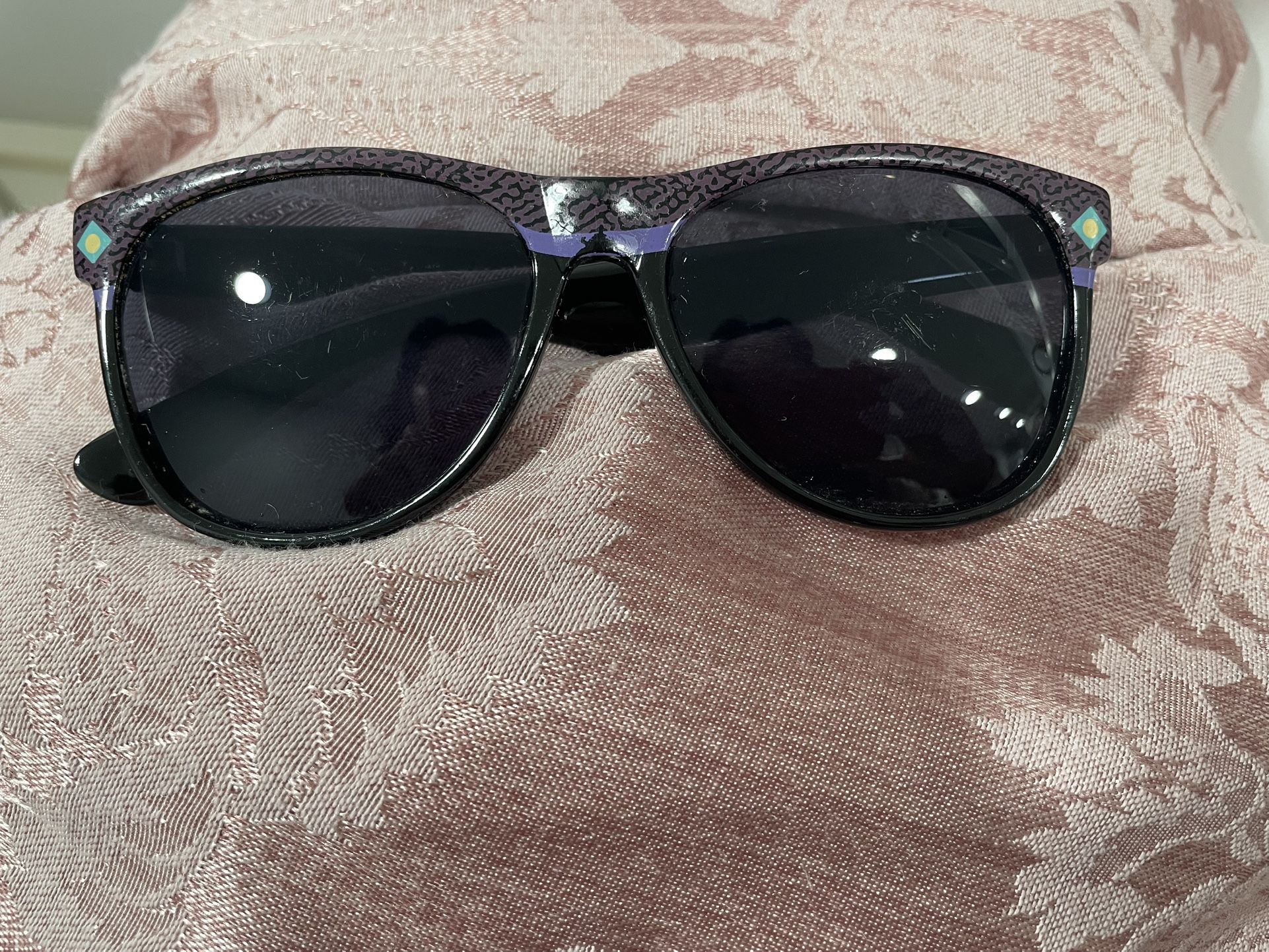 Rad vintage 1980s sunglasses with a signature black and purple speckled design and colorful diamond print very characteristic of that era Has some scuffs/wear and could use a bit of an adjustment but otherwise great condition considering it’s age 80s colorblock summer glasses stranger things speckle
