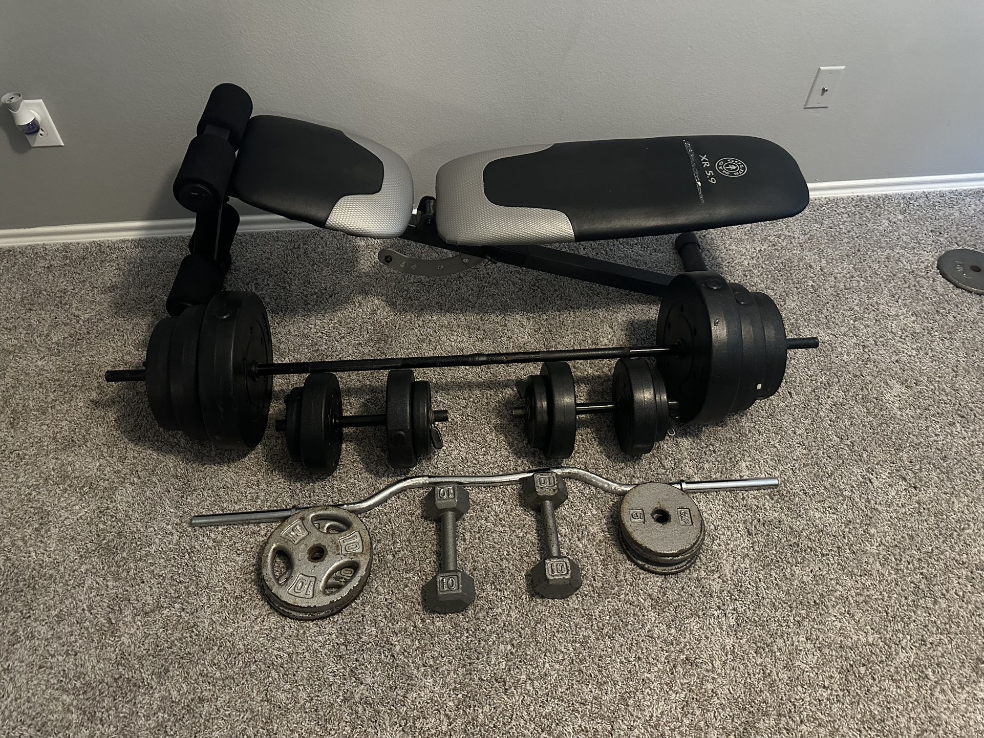 Everything sold together. Has some wear and tear but great for beginners. PICK UP ONLY. •Bench (adjustable to multiple degrees) •Straight + Curl bar (one set of clamps, fits both) •140lbs of Vinyl weights. •40lbs of plates •10lbs dumbbells
