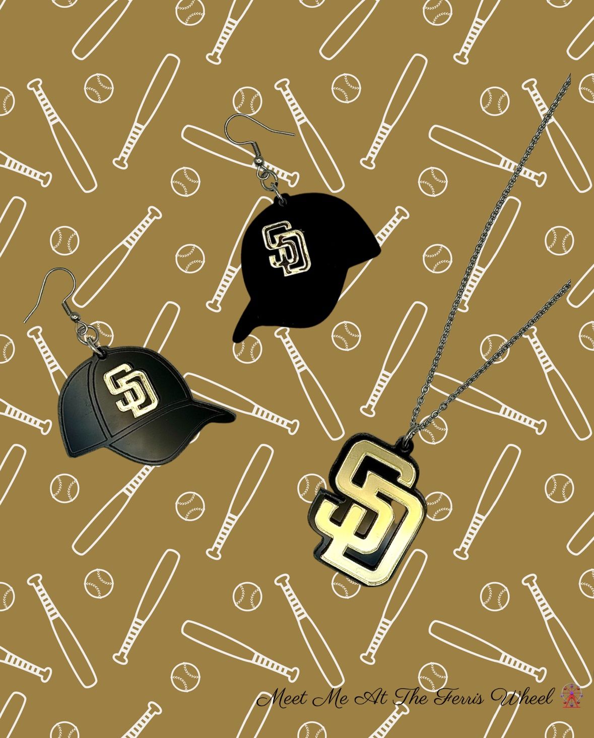PLEASE READ!! Custom orders available: Discount on multiple items $18 - SD Padres necklace. Gold mirrored acrylic layered on top of black acrylic on a thin stainless steel chain that won’t tarnish or turn your skin green. 16” long. $22- SD Necklace made on a thick stainless steel chain adjustable up to 20”. Longer chains available upon request $16- Baseball Hat Earrings Feel free to message me if you would like a different team